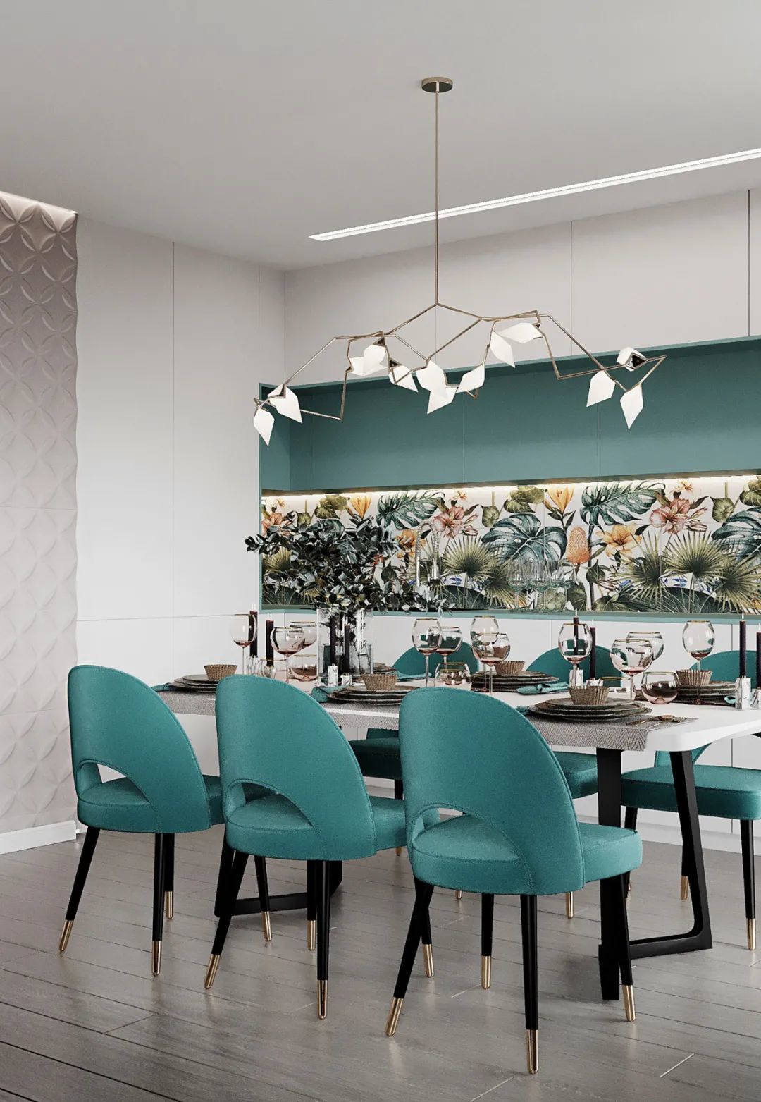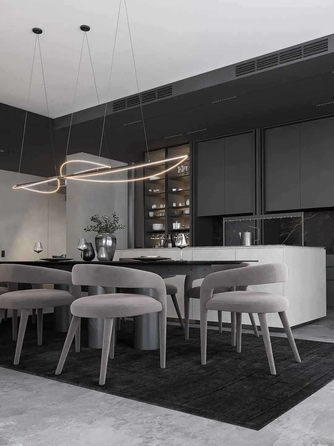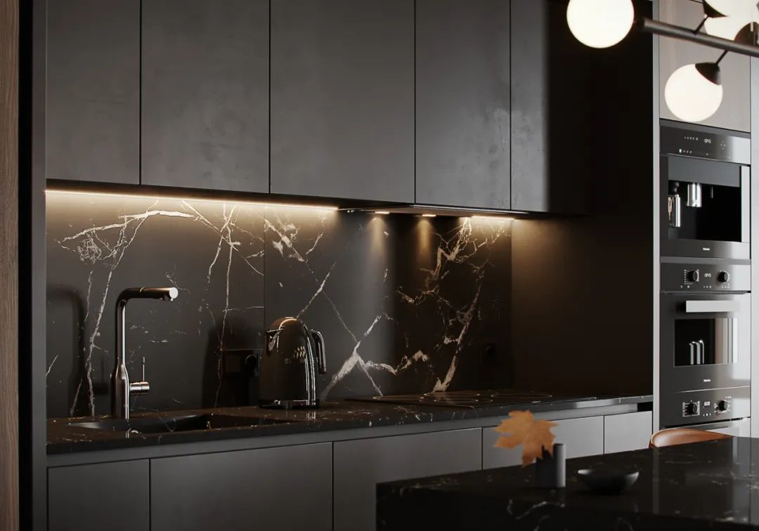 简奢厨房,从墙面到操作台、中岛台,视觉上起到连贯性与舒适感,将高贵气质表现得淋漓尽致,很好的平衡了奢华与功能。