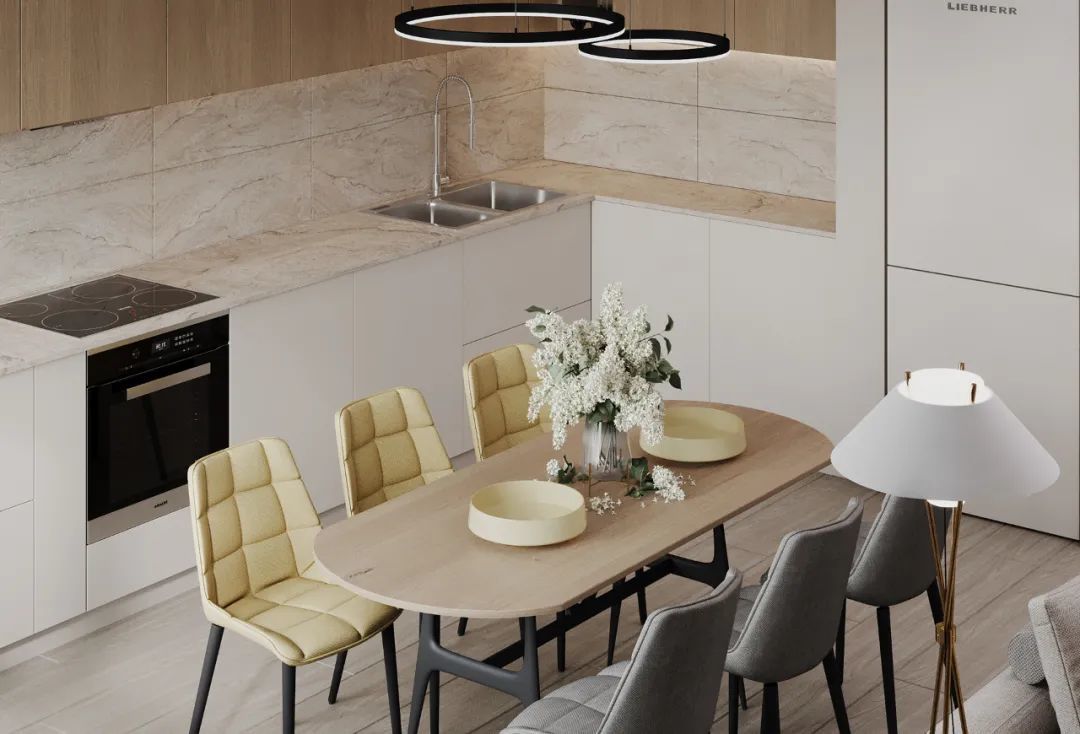 开放式的厨房,木的温润质感与自然的清透相互交融,航美白色超漆感无漆实木平板门点缀其间,空间有了淡雅而丰富的温度层次,焕发温暖治愈的视觉魅力。
