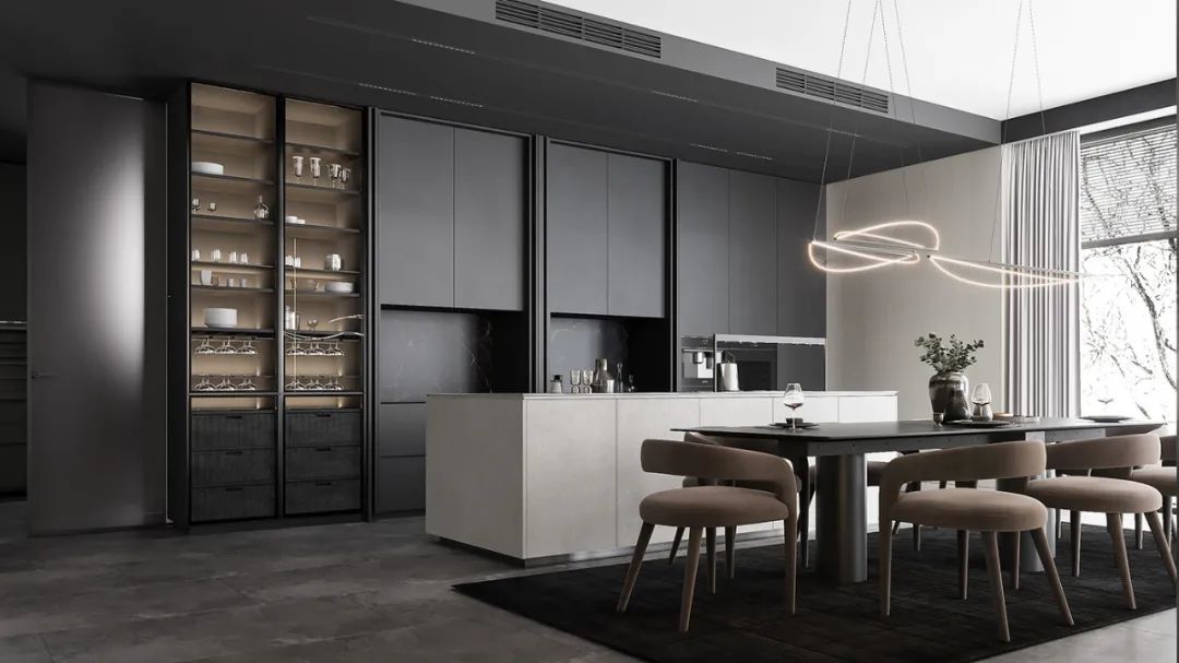 这套橱柜,简中带奢,沉中带暖,高级灰柜门和玻璃门交叠,赋予了空间更饱满的视觉层次,中岛台的嵌入,又升华了空间的轻奢格调。