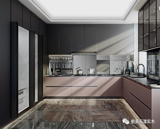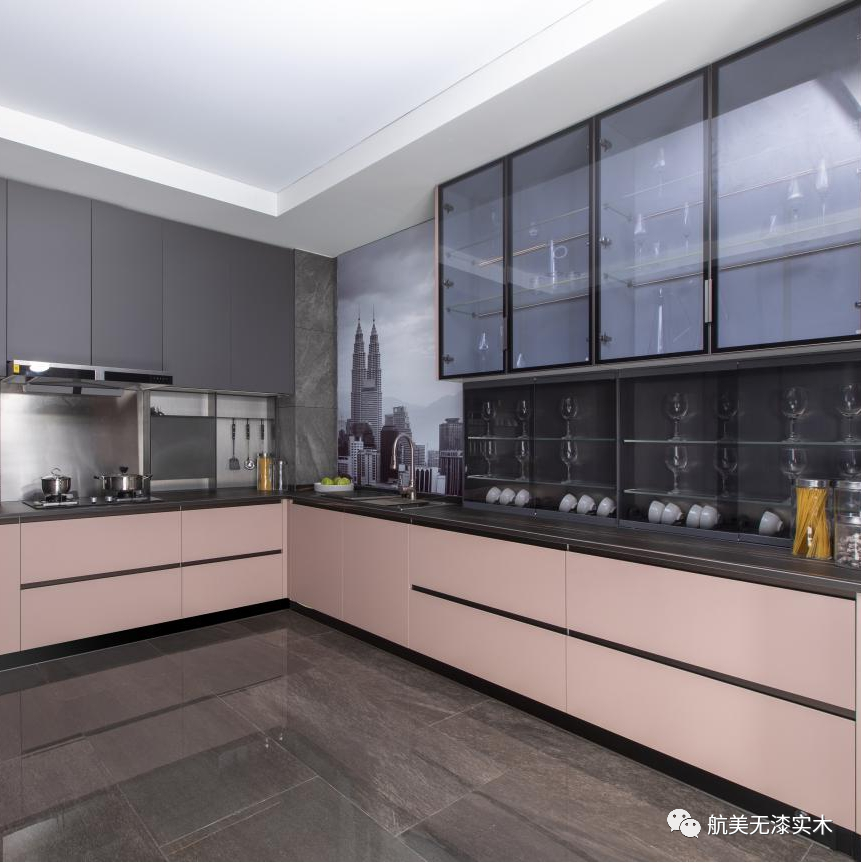 宁谧的高级灰空间,航美设计师采用超漆系列粉色配合灰色,来削弱整体的厚重感,简致的设计,进而来传达精致的定制理念。