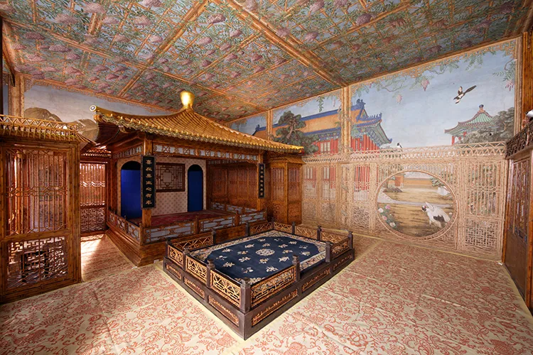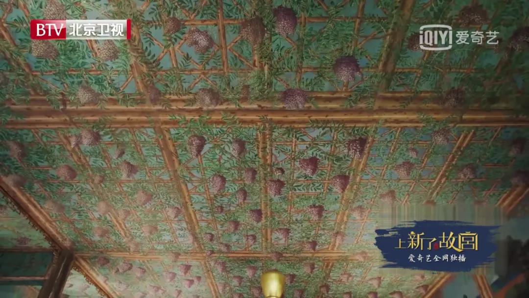 西4间的顶棚饰以竹架藤萝的海墁天花,周围竹篱环绕,楼阁间白鹤起舞,喜鹊嬉戏,姚黄魏紫,争芳斗艳,使人仿佛置身于天然美景中,实为装饰室内的通景画。