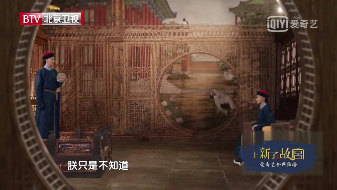 此画出自乾隆年间宫廷画师郎世宁、王幼学之笔,裱糊于室内墙壁,一扫丹柱椒壁之庄严单调。