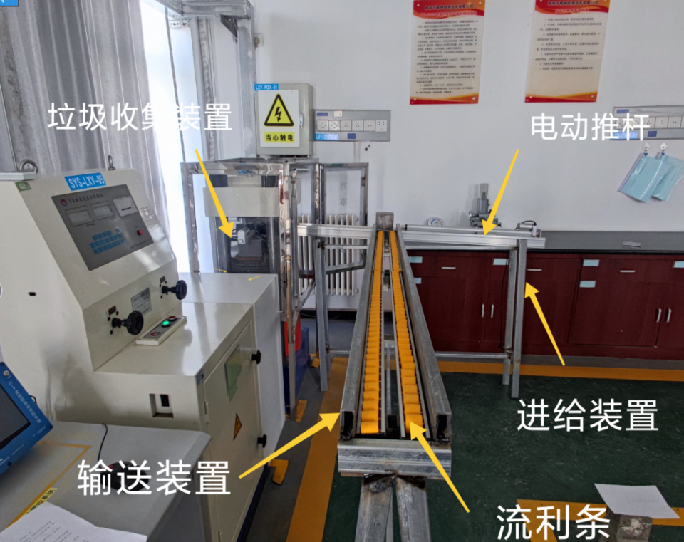 此项半自动改造有3大亮点功能。一是设置有输送装置:采用2条40*2000mm输送用流利条,不用油不用电安全环保可快速将待测试块输送到进给装置位置。二是设置有进给装置:采用行程为600mm的电动推杆将试块推到万能压力试验机中央。三是设置有垃圾收集装置:采用行程为200mm的推杆将试块推下工作平台通过设置在工作平台下端的集料器将垃圾收集在集料箱中。