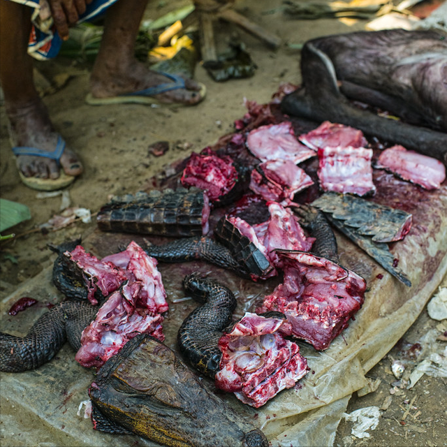 很多人可能猜出来了,这是非洲的鳄鱼肉,摆在地摊上的鳄鱼肉,是摊主刚刚宰杀的,很是新鲜,这种肉在非洲价格也是属于比较昂贵的,比牛肉还更贵。