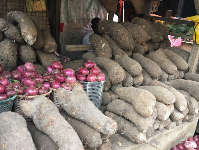 这是农贸市场的一个摊主,售卖的是蔬菜,有国人熟知的洋葱,也有大板薯,更有土豆等非洲常见的食材。
