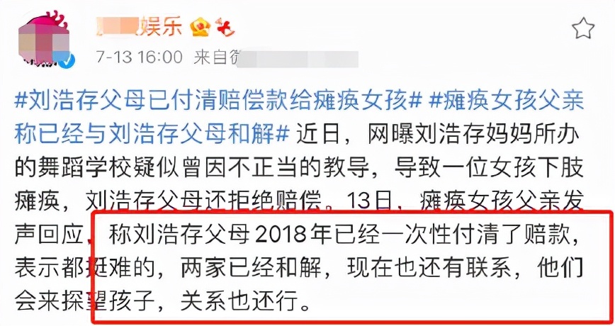但据了解,刘浩存的父母早在2018年一次性给女孩家庭付清了赔款,之所以拖了六年是因为自己家庭也有困难。且女方父亲也出来表态体谅刘浩存父母养家的困难,两家早就达成了和解,现在的关系还不错。