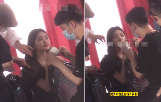 休息期间, 刘浩存坐在椅子上被两个男助理贴身伺候。一个男助理帮其整理发型,一个男助理帮她调整妆容,拿着化妆刷给她嘴唇上色。刘浩存完全没有大明星的架子,整个过程古灵精怪,脖子前后伸缩表情多变,甚至还兴起唱起了歌,非常亲和。