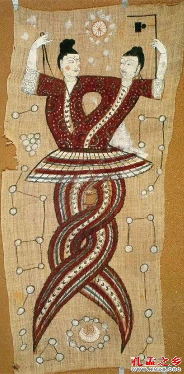 其二,画中女娲和伏羲并排站立,顶天立地,女娲在左,伏羲在右,他们都是人首蛇身,下半身交缠在一起,周围布满星辰。