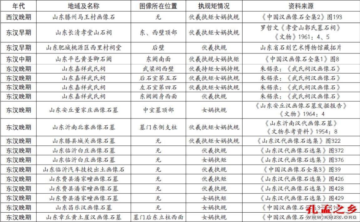 下表列出了山东邹鲁一带从西汉晚期到东汉晚期出土的伏羲女娲执规矩图像统计表。