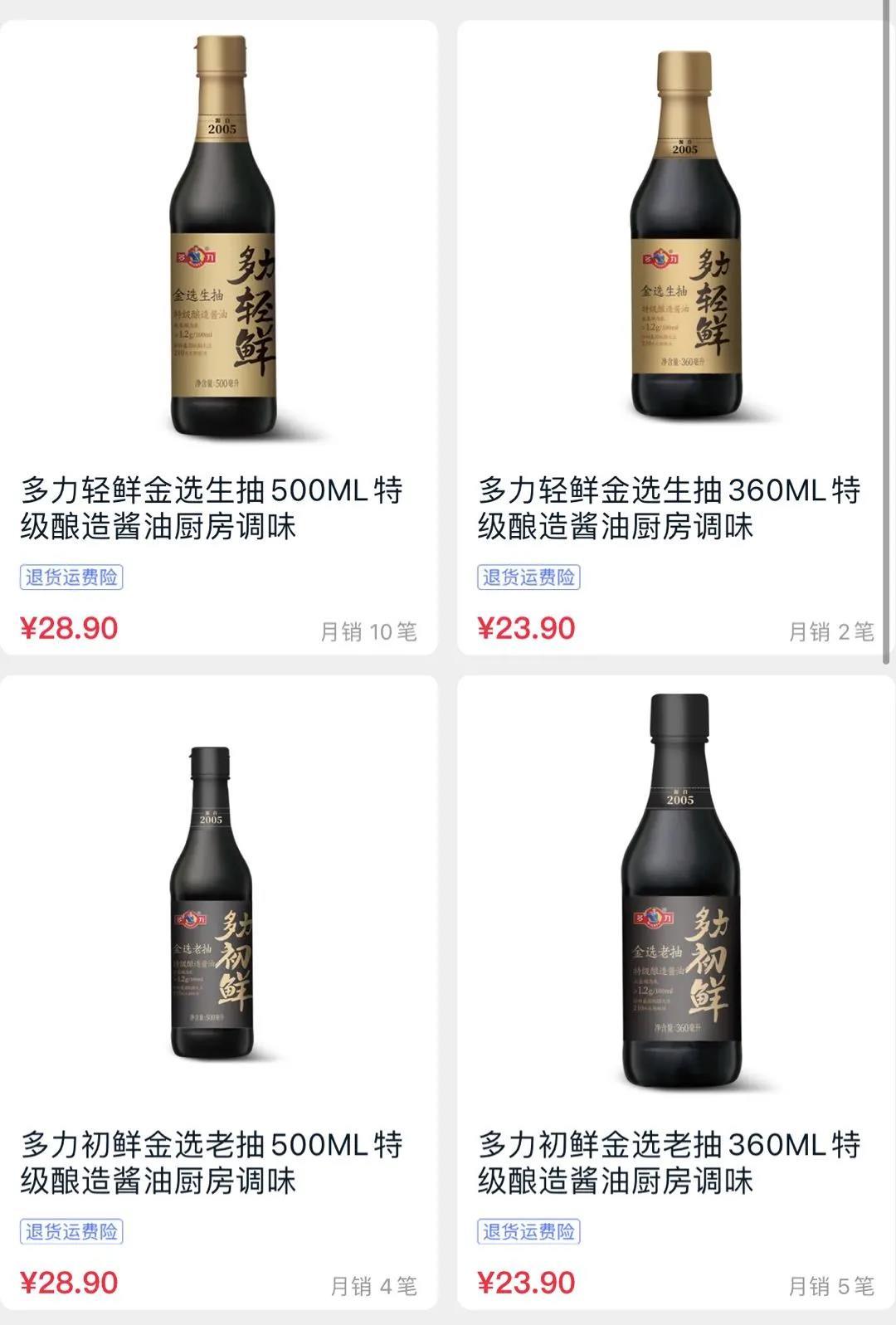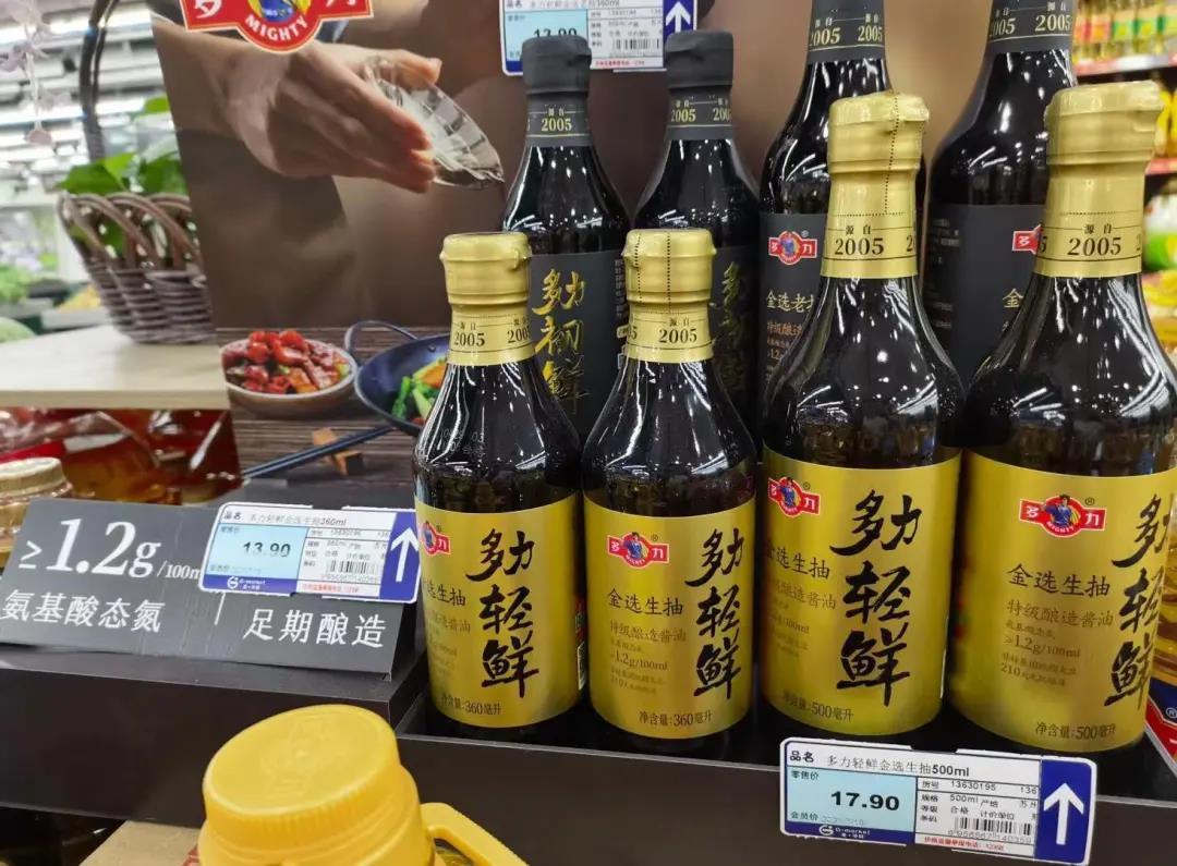 不过,上述两款产品在天猫旗舰店的价格分别为23.9元/瓶(360ml)和28.9元/瓶(500ml)。但根据消费者在终端拍摄的陈列价格分别为13.9元/瓶和17.9元/瓶。无论从电商平台定价还是终端实际销售价来看,多力这两款酱油产品都处在中高端价格带。