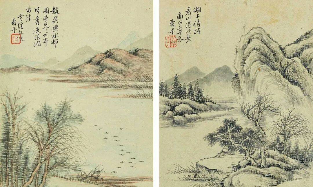 恽南田的山水画初学元代黄公望、王蒙,深得冷澹幽隽之致,他的山水画,不让“四王”,小幅逸笔草草,寄郁勃于悠闲,枯而有润,淡而有奇,自成格局。