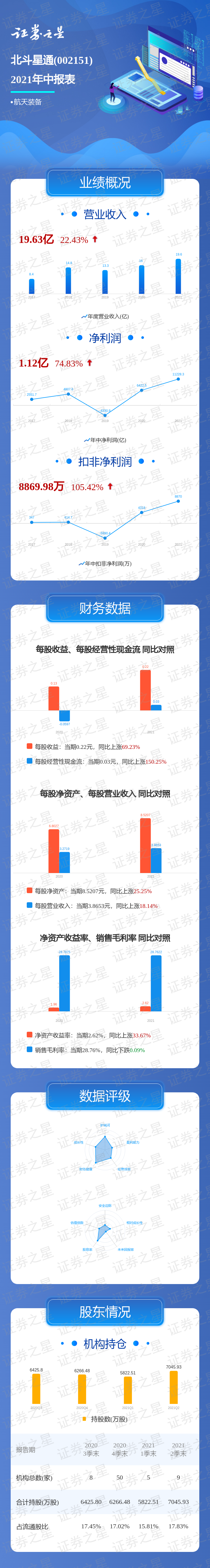 证券之星数据中心讯,北斗星通2021中报显示,公司主营收入19.63亿元,同比上升22.43%;归母净利润1.12亿元,同比上升74.83%;扣非净利润8869.98万元,同比上升105.42%;负债率33.67%,投资收益-91.01万元,财务费用1268.28万元,毛利率28.76%。