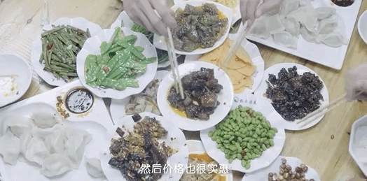 一张长桌琳琅满目地摆满了各式凉菜,荤的素的、便宜的贵的、甜的酸的辣的……能有60多种。