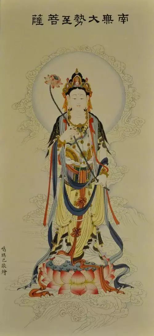 全身光量呈紫金色,也是照遍十方国土,让有缘众生亲眼得见。只要见其一毛孔所放之光,就等于见到十方无量诸佛的净妙光明,所以大势至菩萨也名叫无量光菩萨。