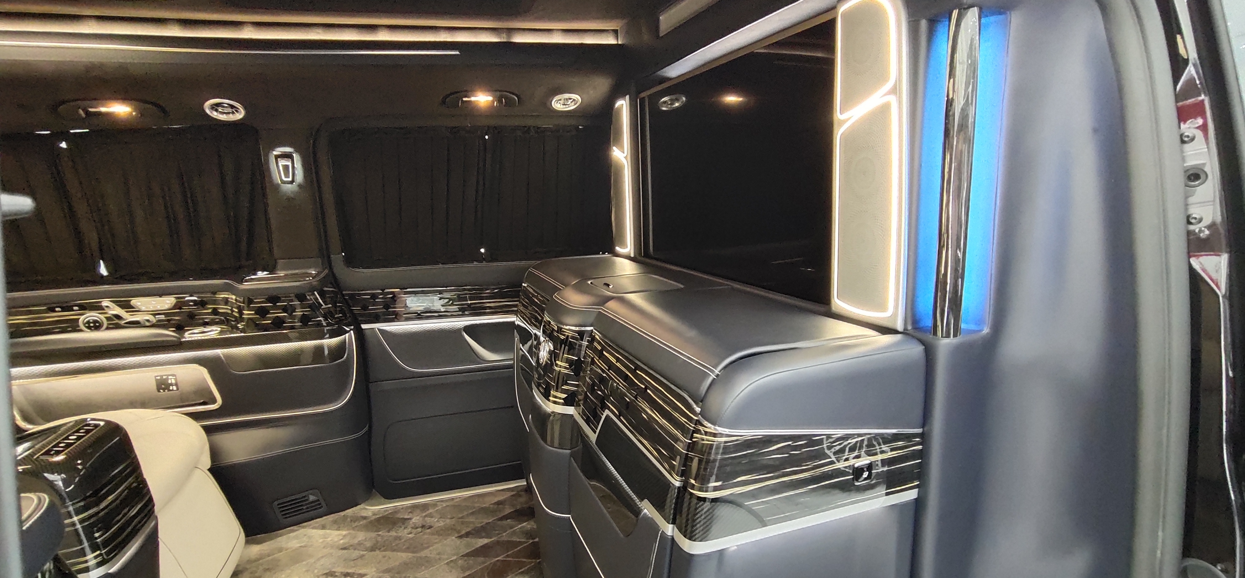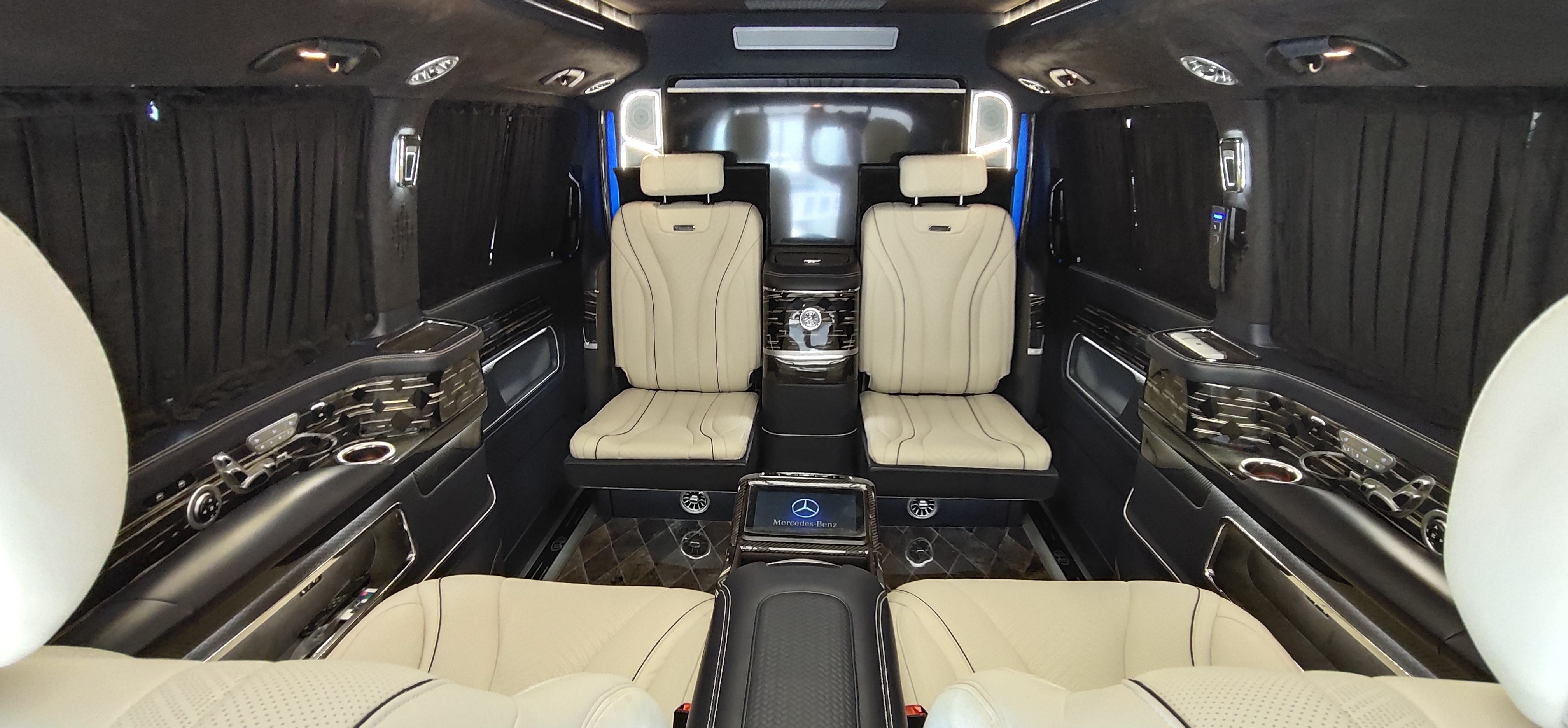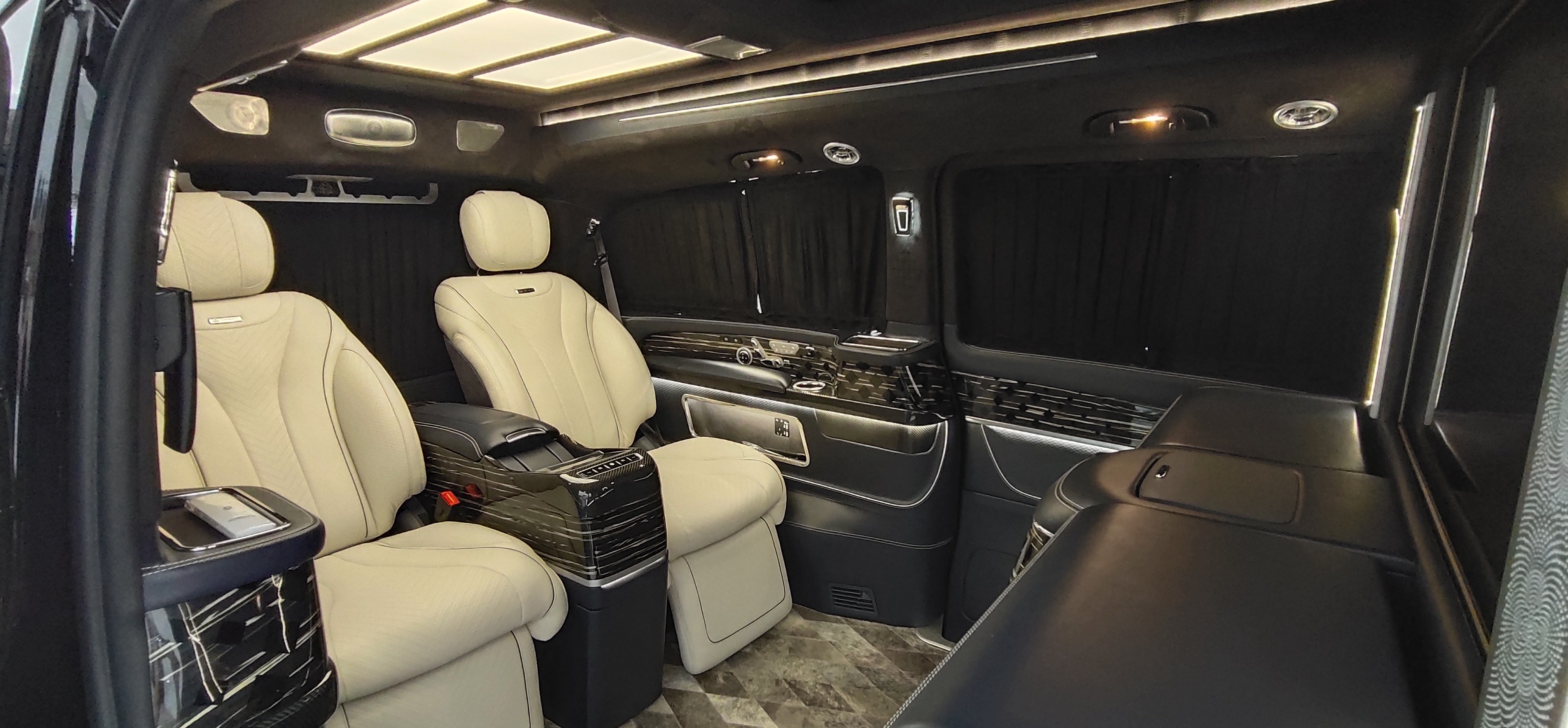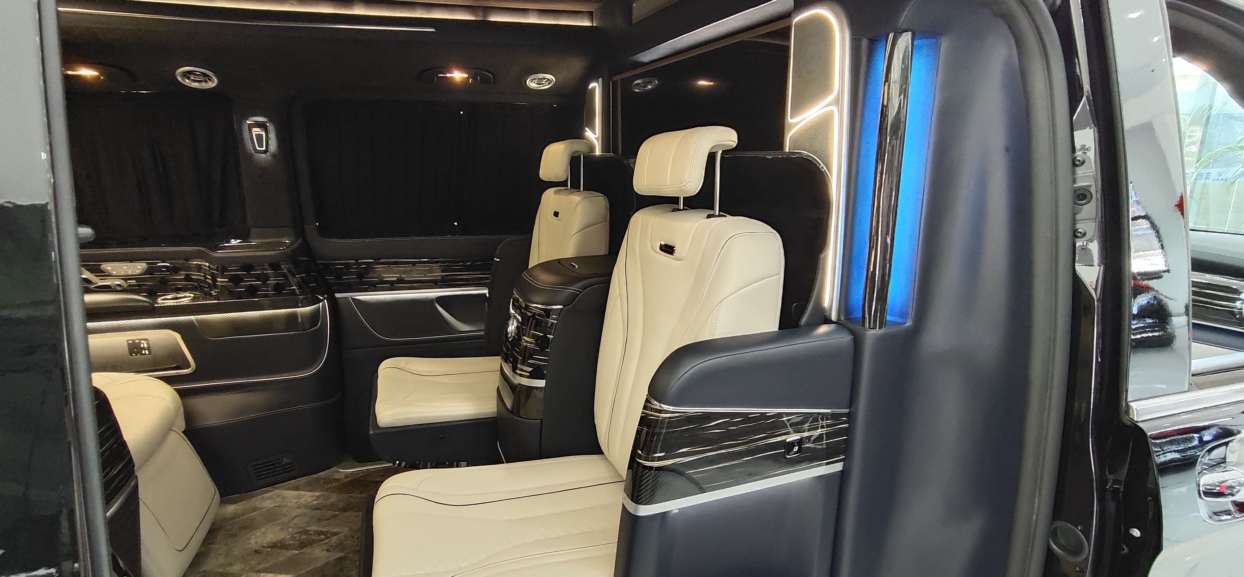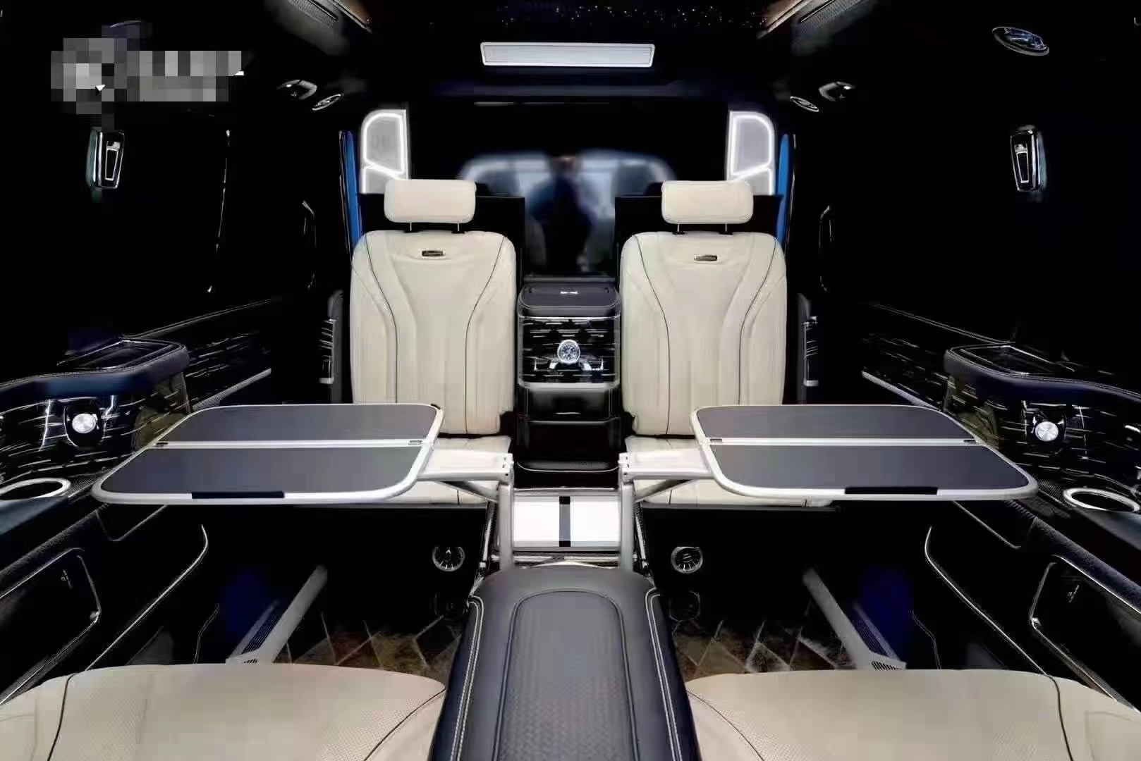 这款奔驰v260内部空间宽敞,改装配置豪华,作为老板的移动的商务办公舱是很不的。整车内部布局为4+2前方吧台处带两个隐藏式秘书座椅。座椅展开后,整个乘客舱内就成为了一个小的会议室。当然这两个座椅也可以作为休息时候的“脚凳”给疲惫的旅途带来舒适时刻。
