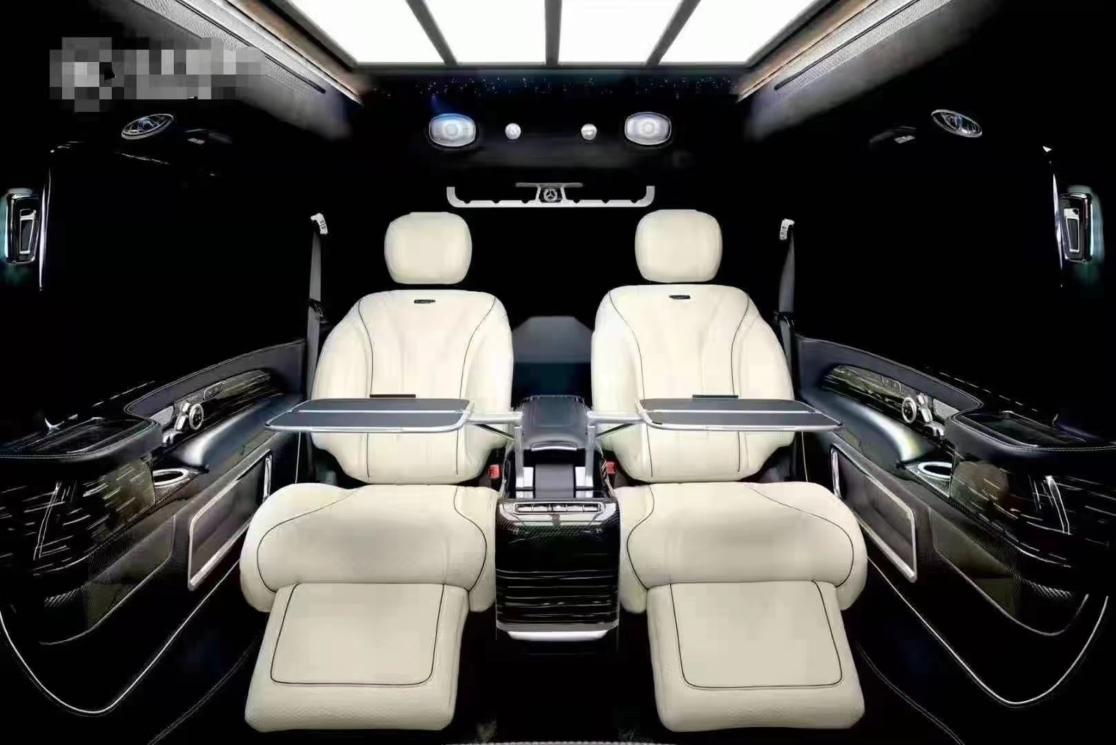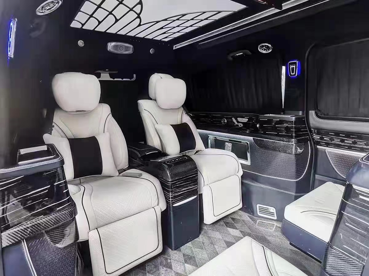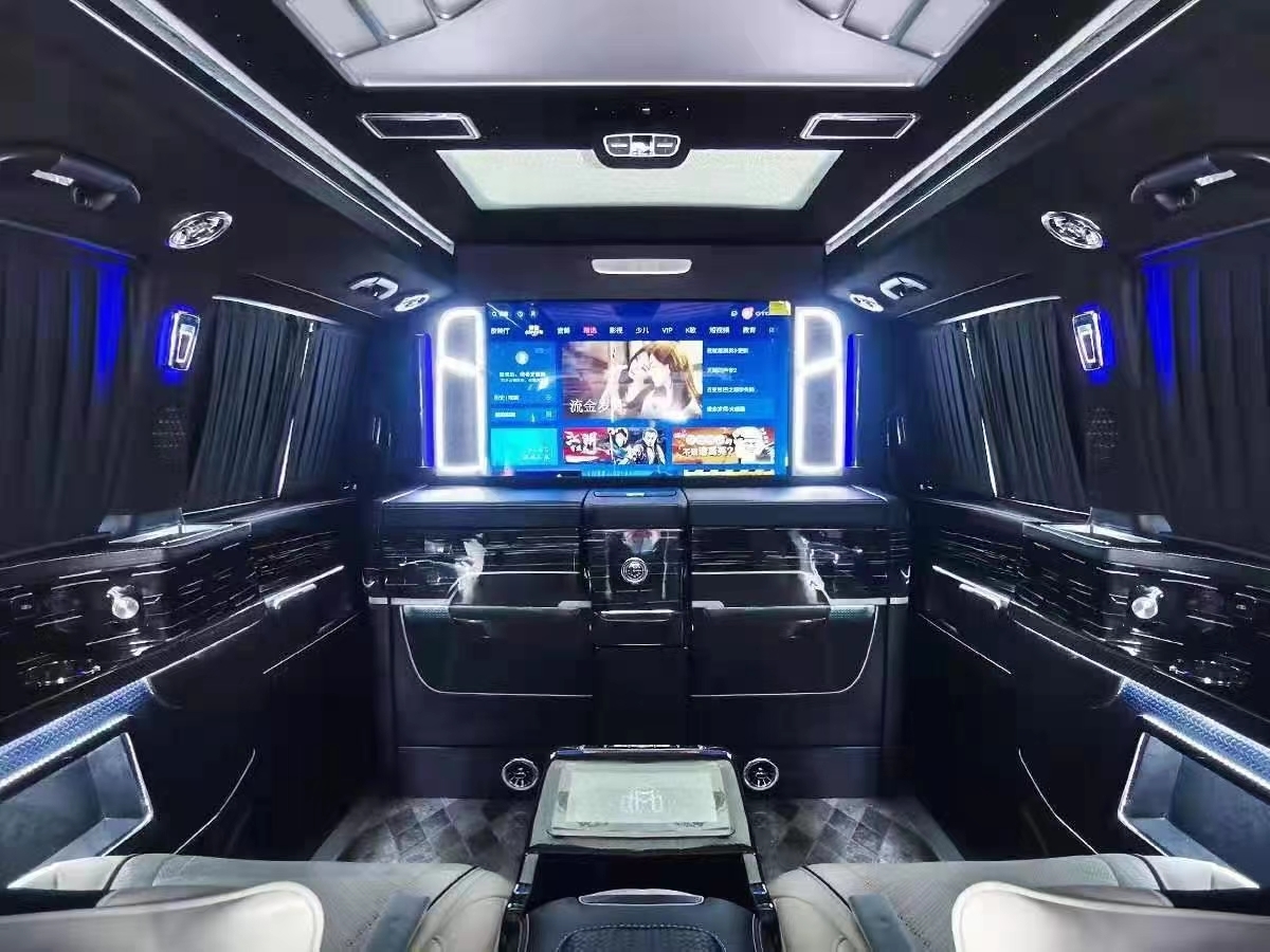 这款奔驰v260改装4+2版本中,车顶是整体开模由专业设计师打造而成,迈巴赫式的顶灯配备劳斯莱斯式的星空顶灯,更添加了几分奢华气息。大面积的木纹装饰板,典雅豪气。整车内饰采用了大面积的真皮包裹,质感很棒,触感更舒适,做工精细。