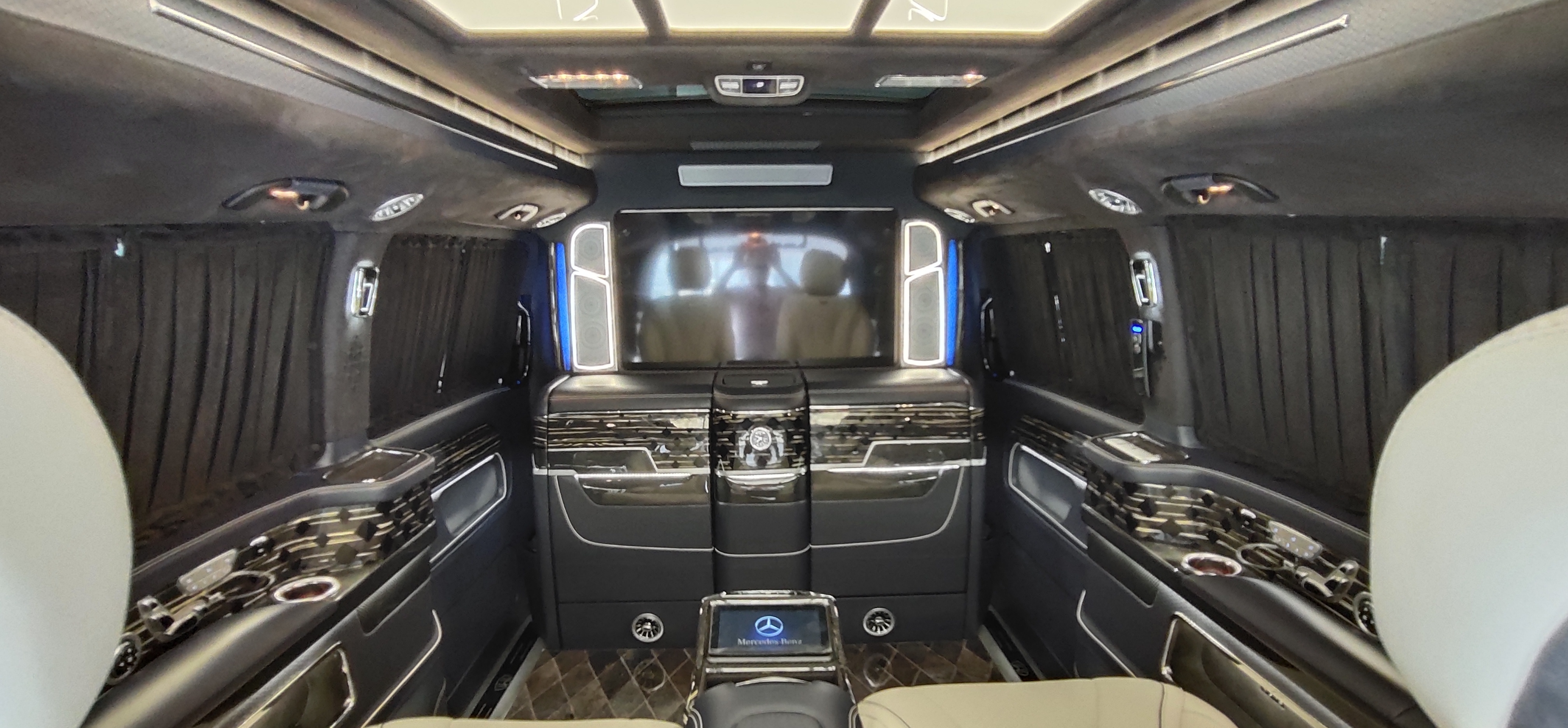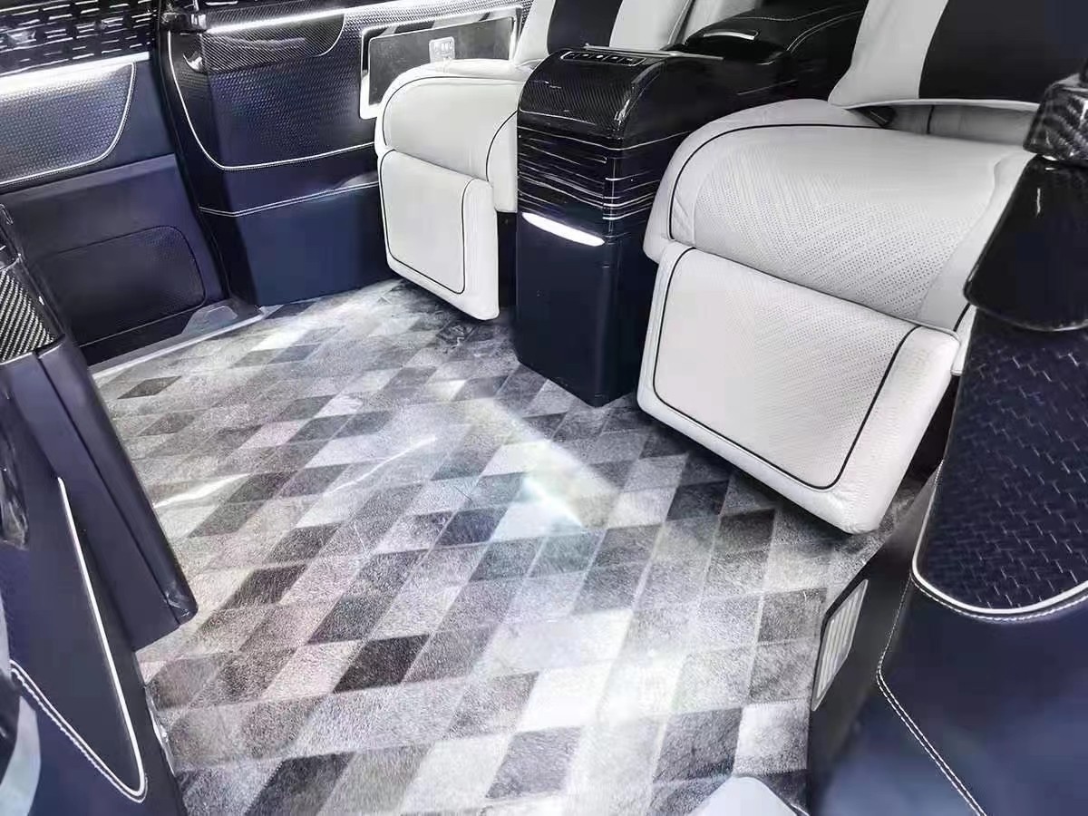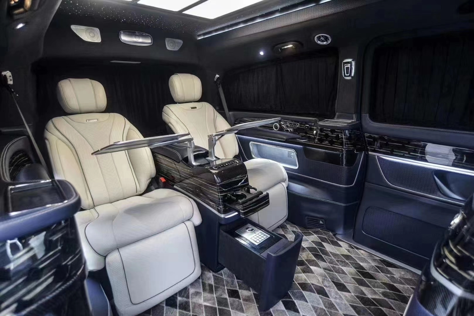 这款奔驰v260改装4+2版本中,车顶是整体开模由专业设计师打造而成,迈巴赫式的顶灯配备劳斯莱斯式的星空顶灯,更添加了几分奢华气息。大面积的木纹装饰板,典雅豪气。整车内饰采用了大面积的真皮包裹,质感很棒,触感更舒适,做工精细。