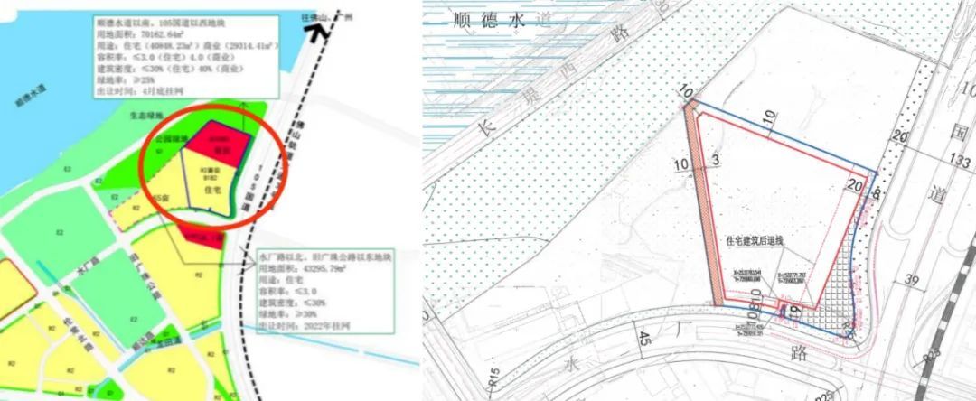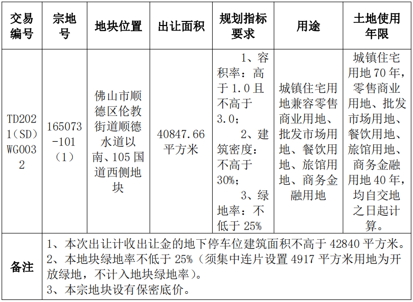 宗地位于顺德水道以南、105国道西侧,共占地40847.66㎡,要求容积率>1.0且≤3.0,建筑密度≤30%,绿地率≥25%,并设有保密底价。