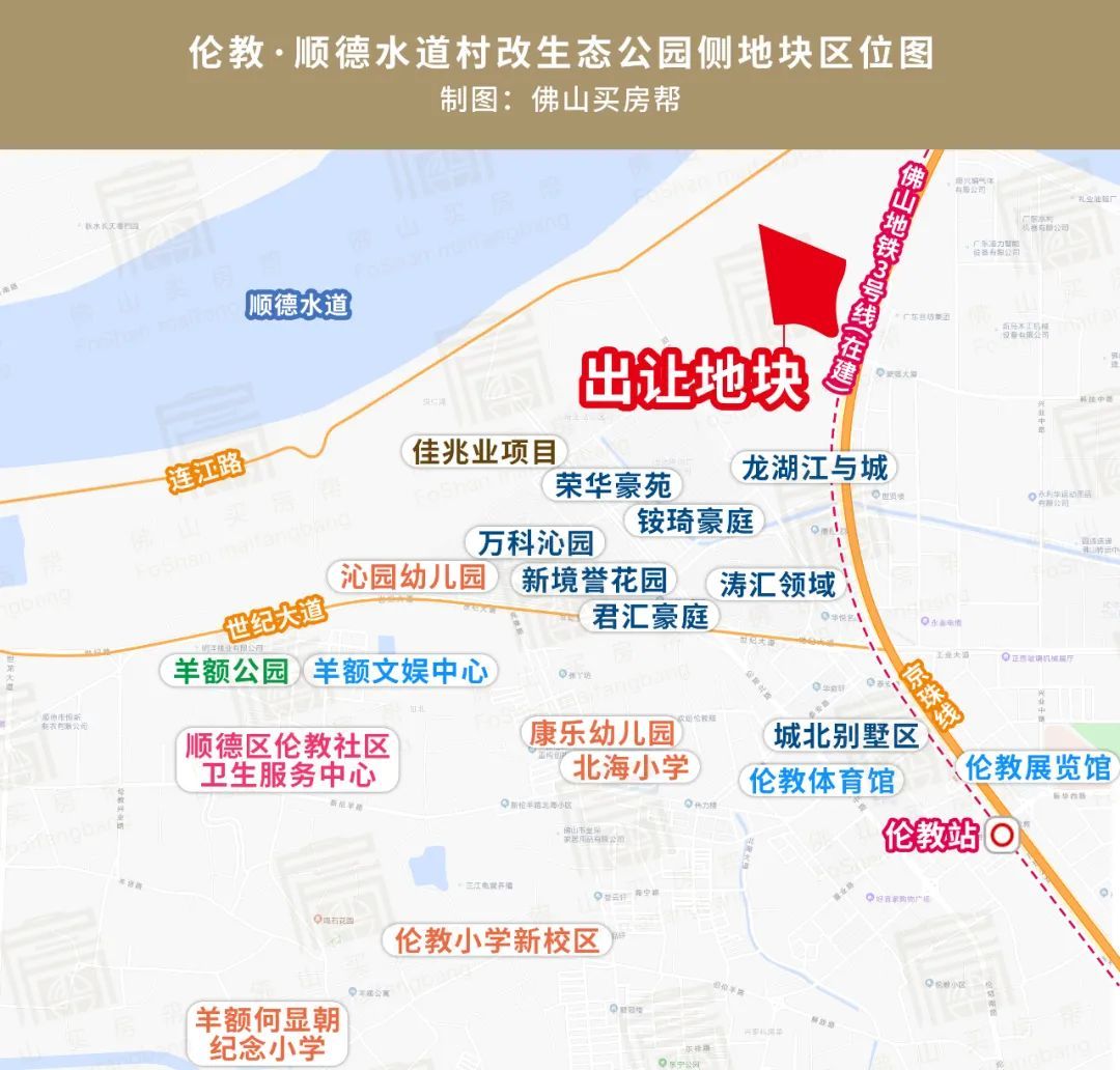 从地理位置看,地块位于顺德水道南侧,未来可北向望江,在建的佛山地铁3号线从地块东侧经过,和最近的伦教站约1.5公里直线距离。