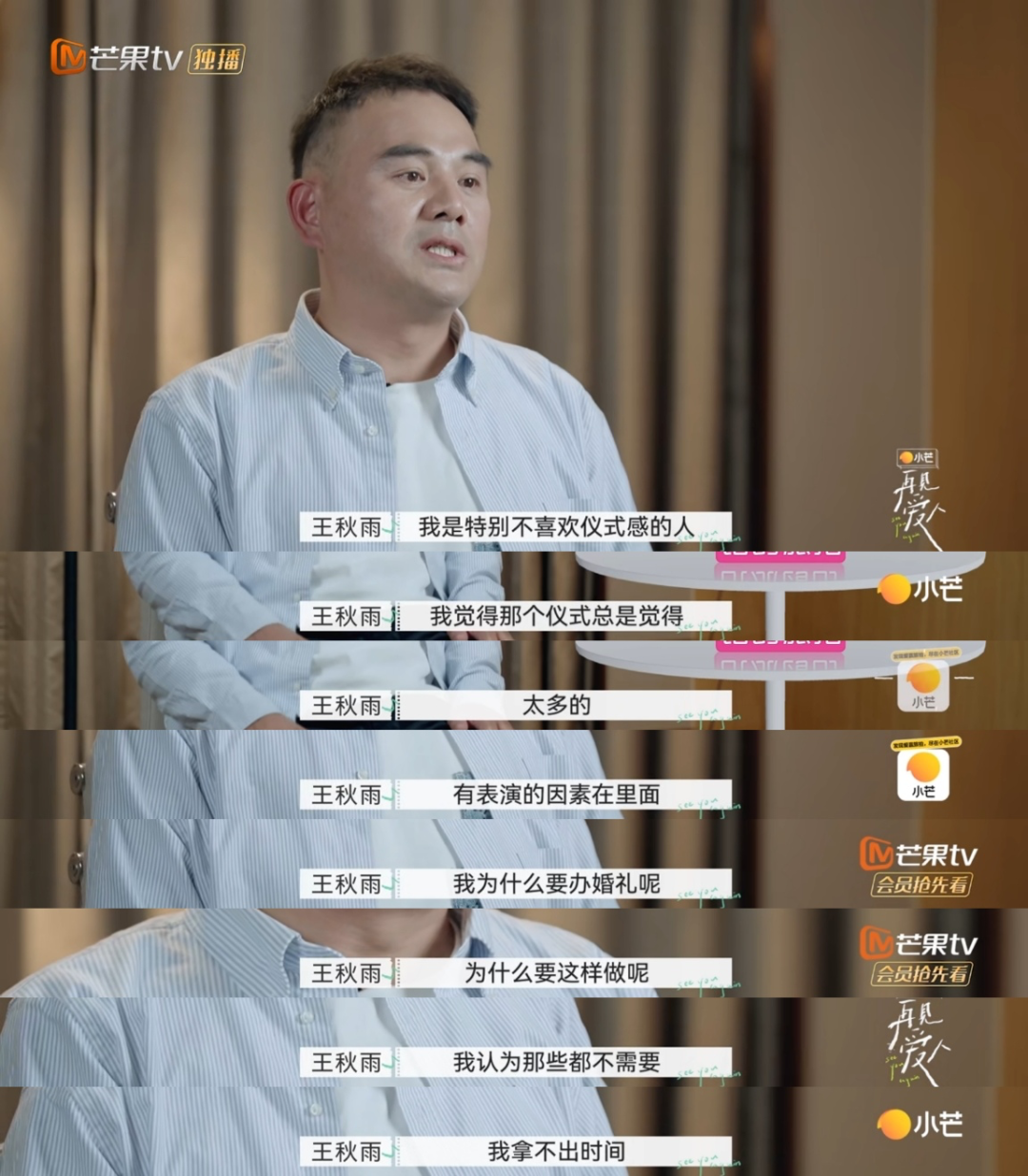 身为编剧的王秋雨是个行动派,他的事业心很重,随时随地都在写剧本,对妻子朱雅琼的关心都是细微小事之中。用他的话说,他对朱雅琼的好都是不值得一提的。而他也讨厌仪式感,认为是浪费时间,这一点引起了观察室女观察员们的不满。