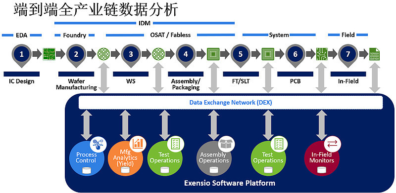 Edward介绍,Exensio平台是一套半导体供应链大数据分析基础设施。如果将整个产业链大致分为设计、制造及封测三大板块,根据每一个环节的特性,Exensio平台都有相对应的产品模块以供选择。具体来看,该平台包含了用于半导体生产缺陷侦测与分类模块(Fault Detection and Classification, Exensio-Process Control)、产品测试优化模块(Exensio-Test Operations)、半导体良率管理系统模块(Exensio-Manufacturing Analytics)与封装优化模块 (Exensio – Assembly Operations) 等,覆盖从IC设计、晶圆制造,到封装和测试等的半导体全产业链。