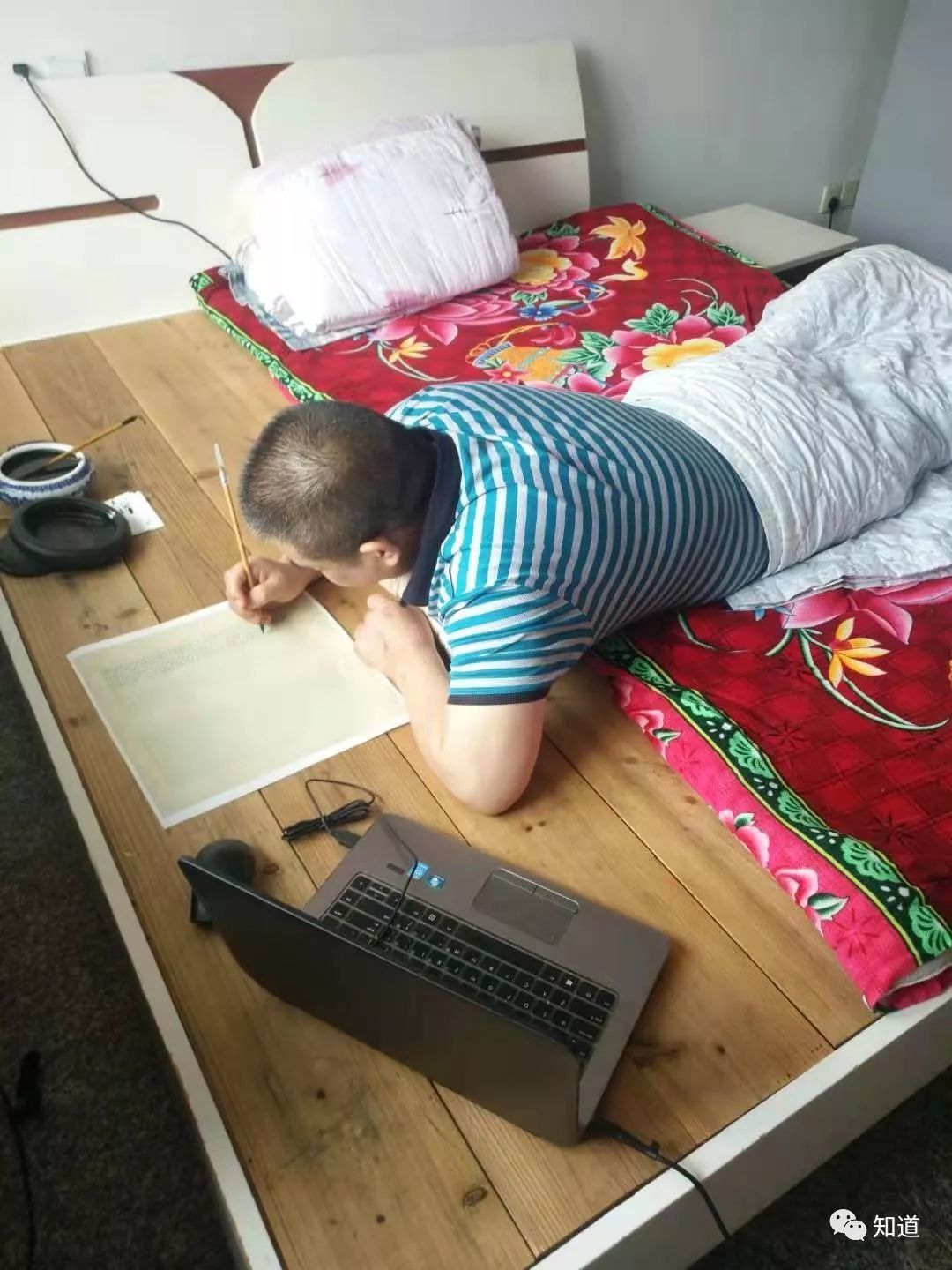 2019年的杨文彪,坐也坐不起来了,不能坐,他就开始趴在床上写字,并自嘲为“趴书”
