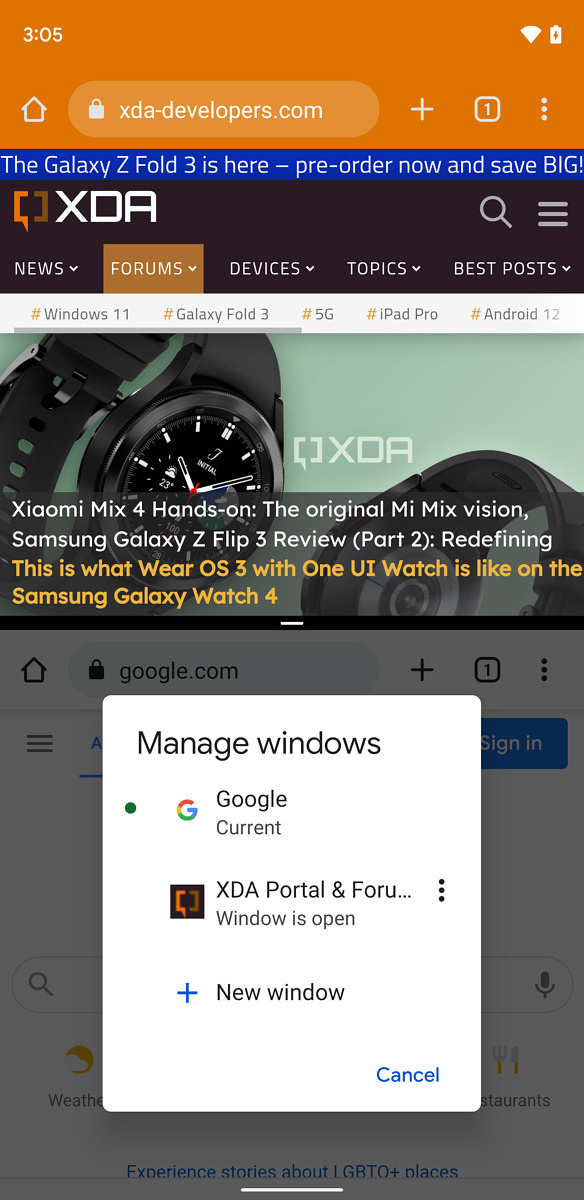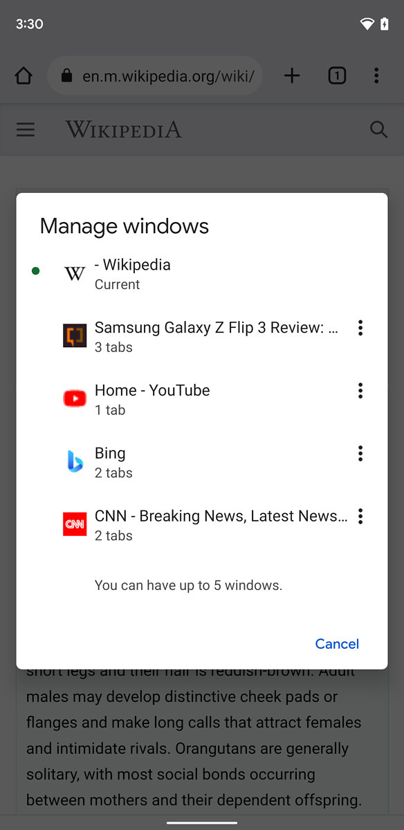 ▲ 在安卓 12 上最多打开 5 个谷歌浏览器窗口