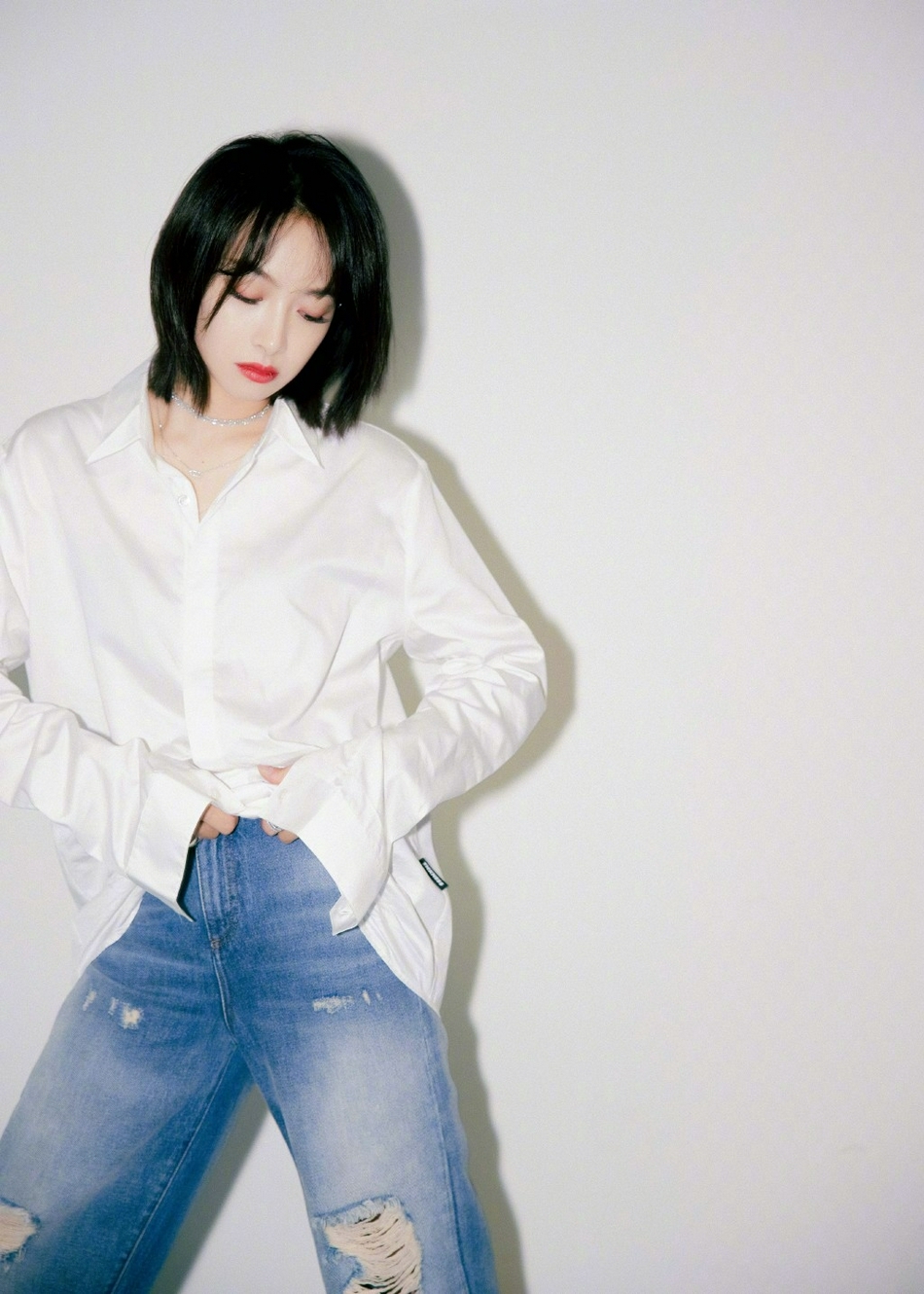 宋茜穿白T牛仔裤慵懒街拍 短发配红唇简洁干练