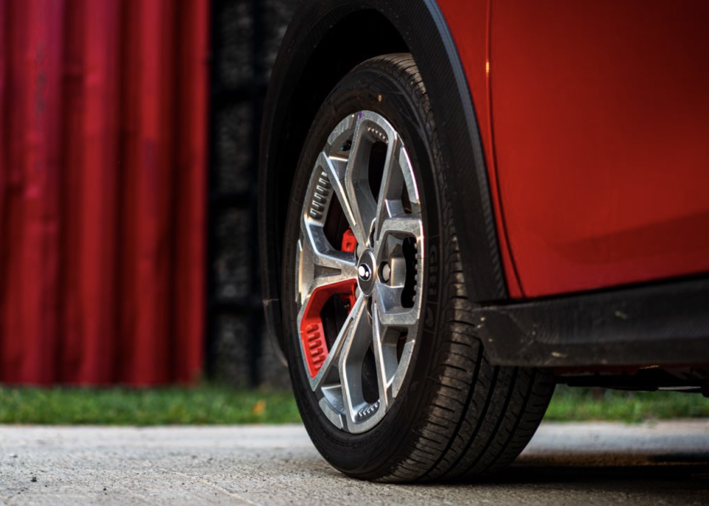 轮毂造型采用了五幅花瓣式设计,并且采用明暗双色搭配,加之其中一幅轮毂采用了红色点缀,并且刹车卡钳采用了红色喷涂。轮胎的尺寸为215/50 R18,这样的大尺寸轮毂和小变宽比轮胎搭配在一起十分运动。