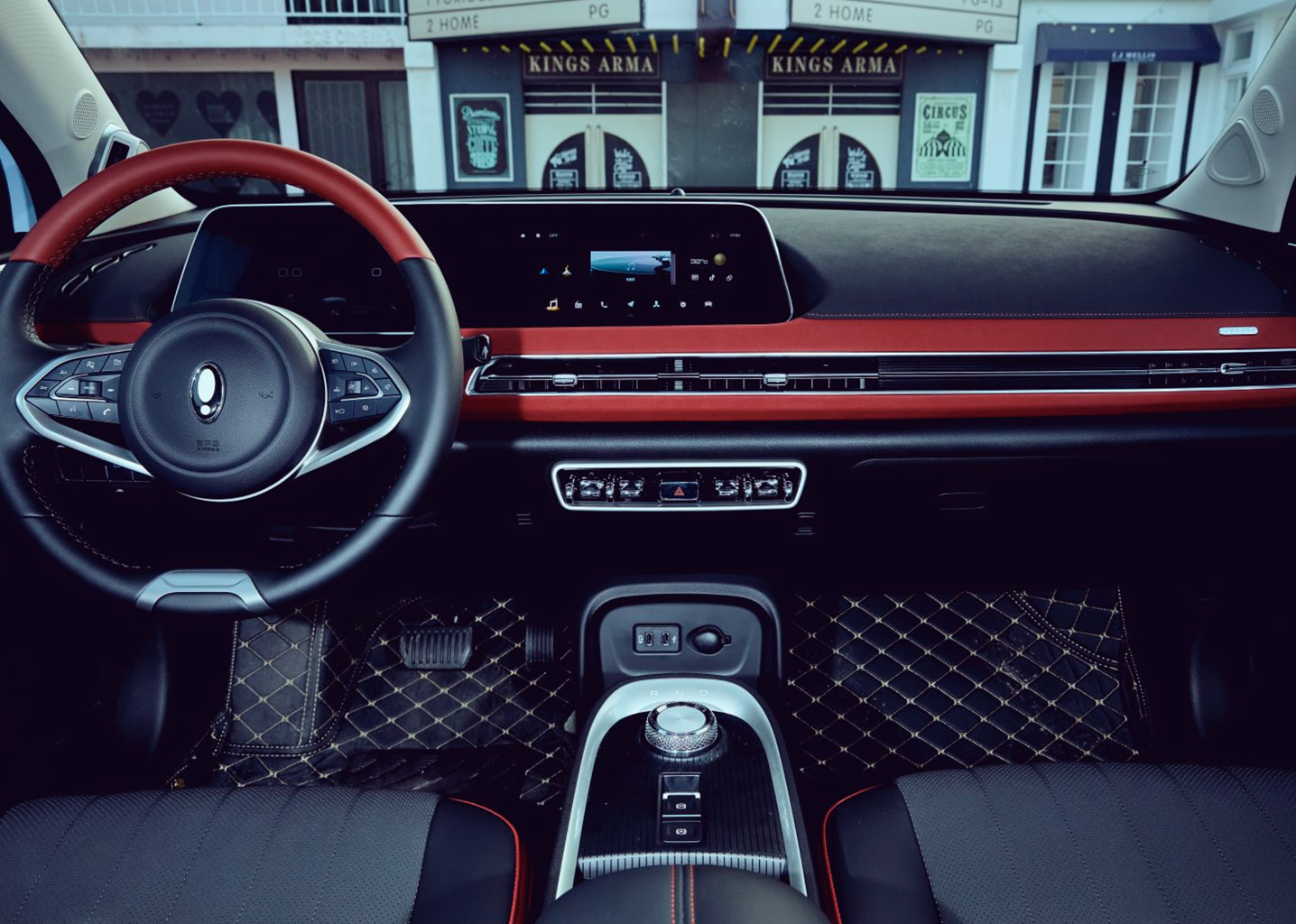 转至欧拉好猫GT内部,整体造型设计采用了与好猫相同的样式,只不过在配色上加入了红色,达到内外统一,凸显出运动风格。仪表盘与中控屏采用了连屏设计,在复古与运动风格上增加了科技感。