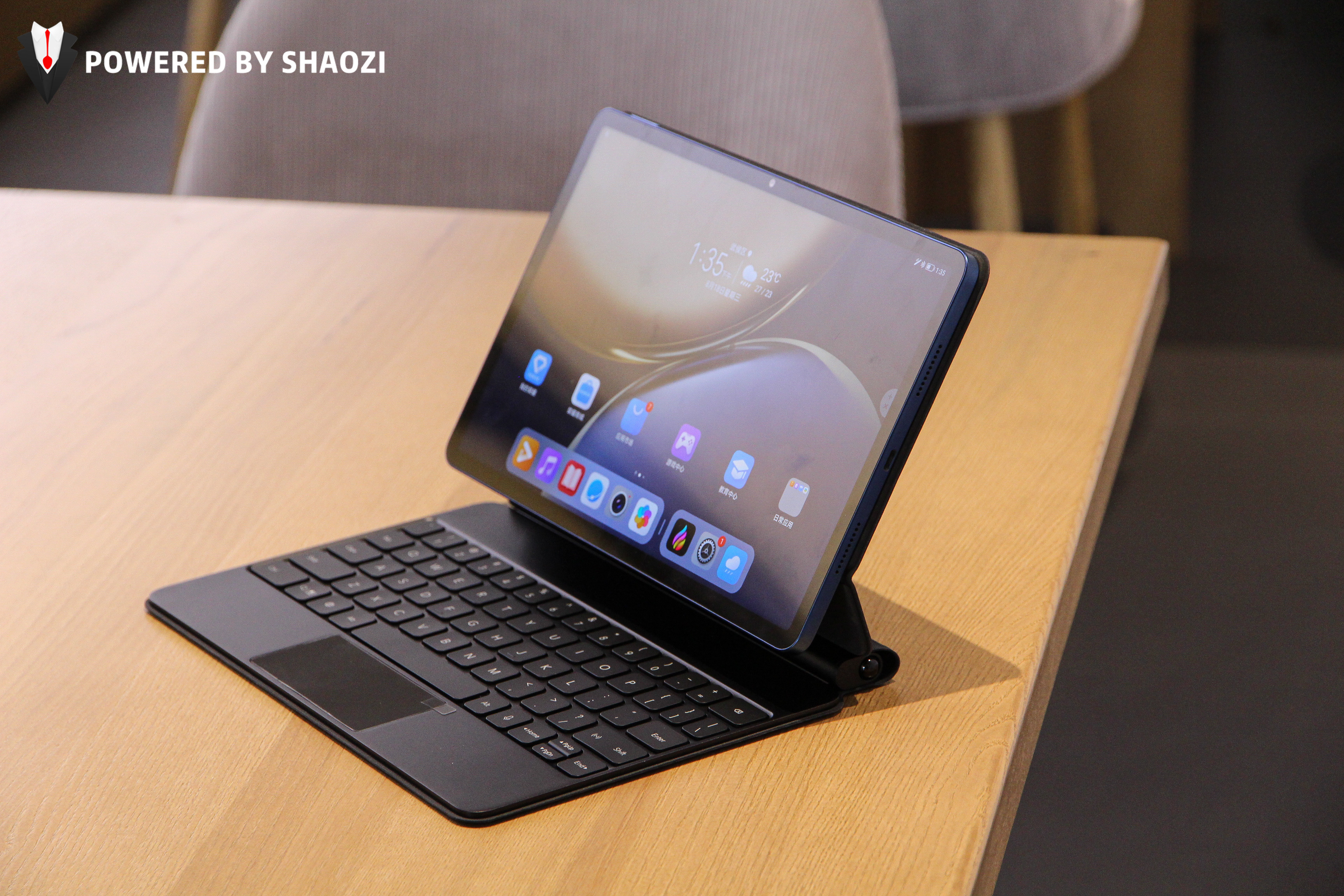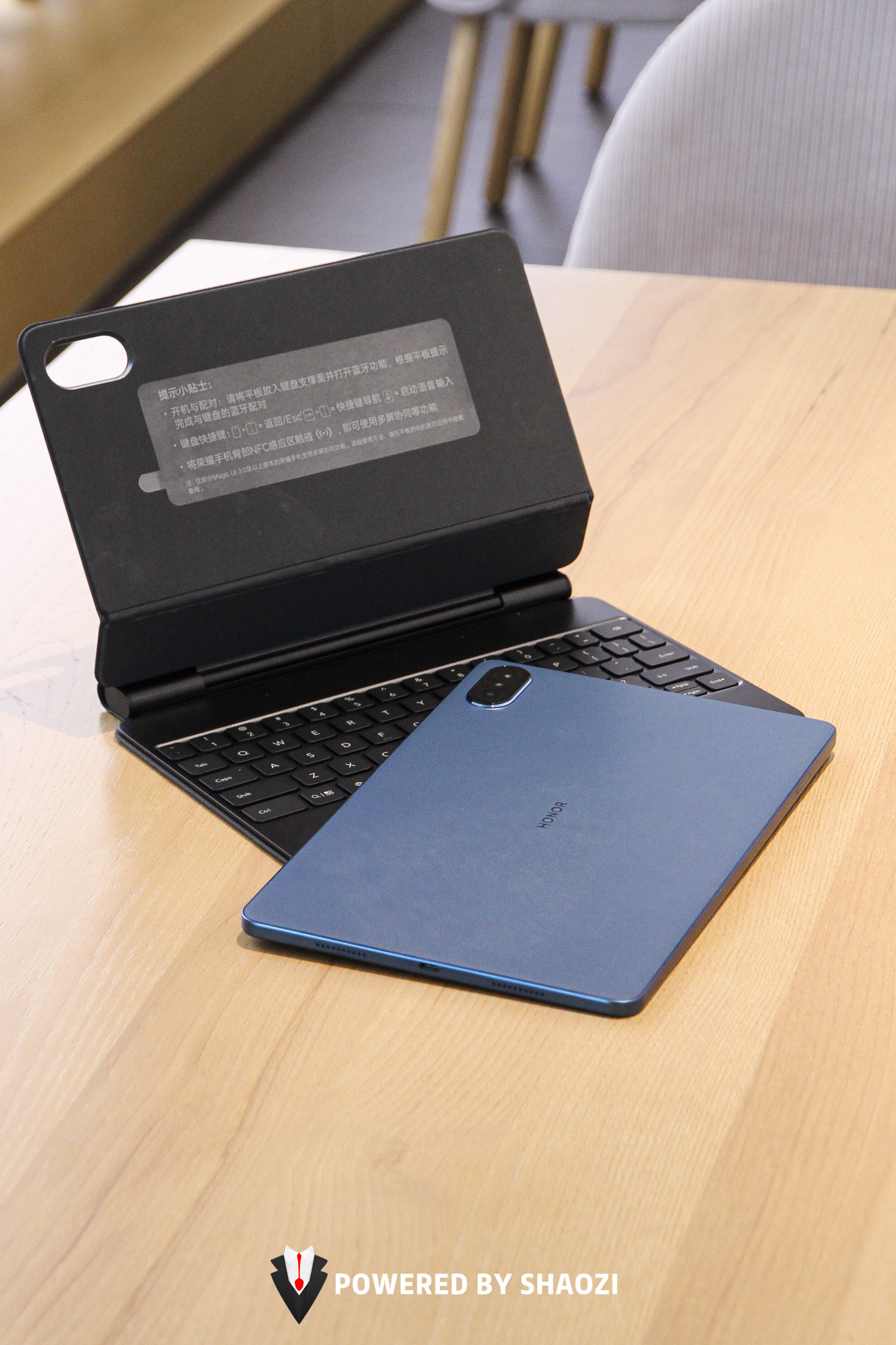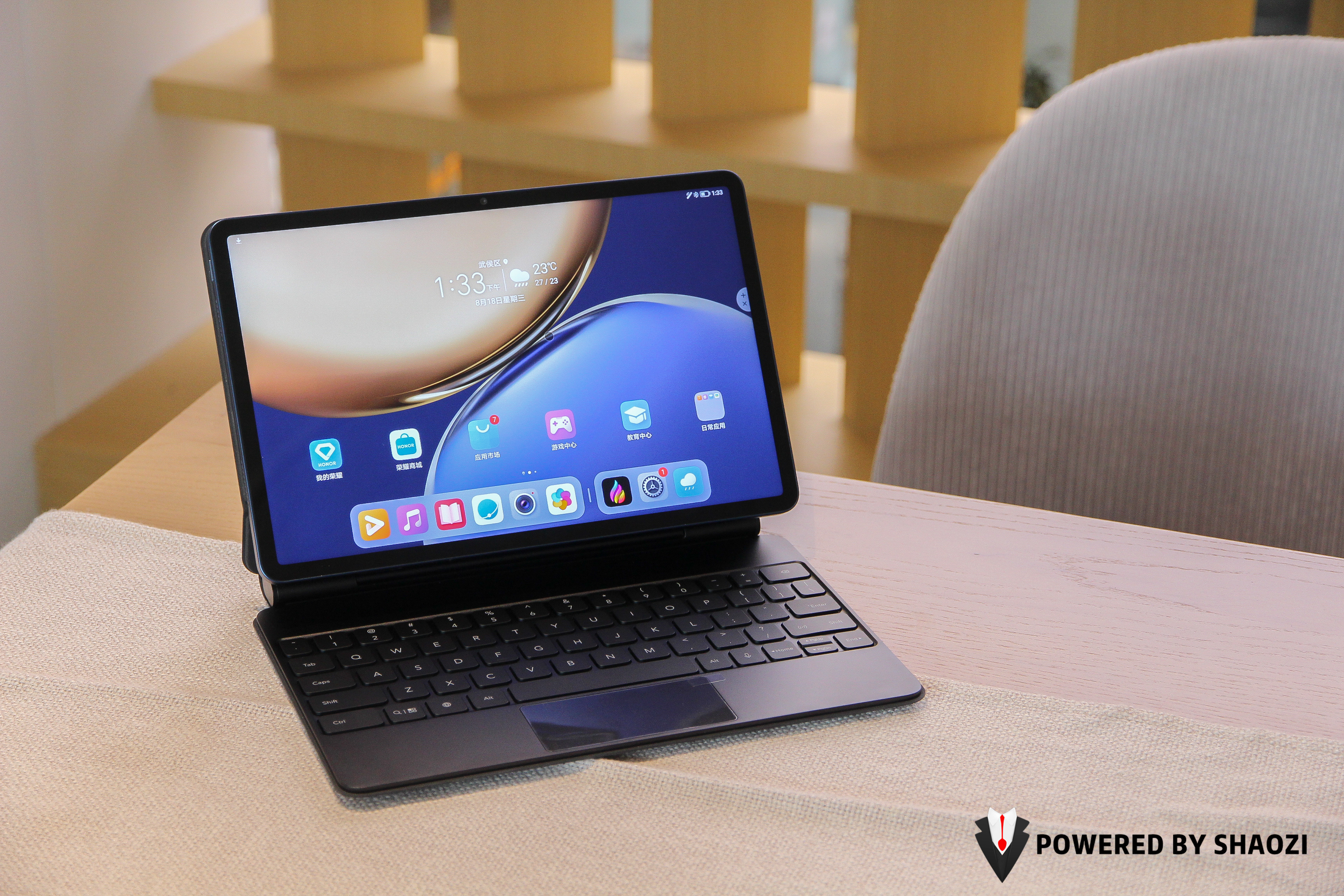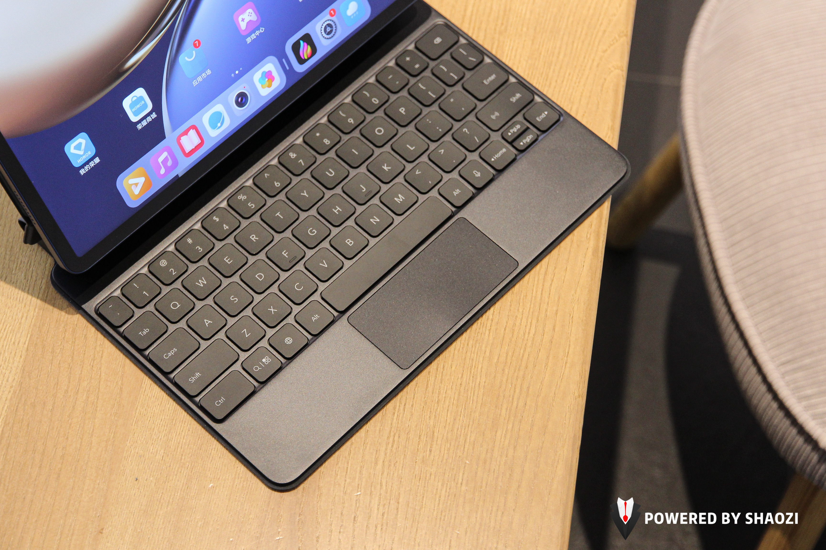 荣耀平板V7 Pro拥有专属的Magic悬浮键盘,采用无感蓝牙连接配对,只要将平板吸附于键盘底座支架上,打开蓝牙就可以自动识别并适配键盘。值得表扬的是这只键盘按键键程为1.3mm,甚至连键盘触摸板都有左右按键可控。120度角调整稳固可靠,还拥有全局语音输入功能,毫不夸张地说搭配上键盘荣耀平板V7 Pro有着与笔记本电脑及其相似的使用体验。
