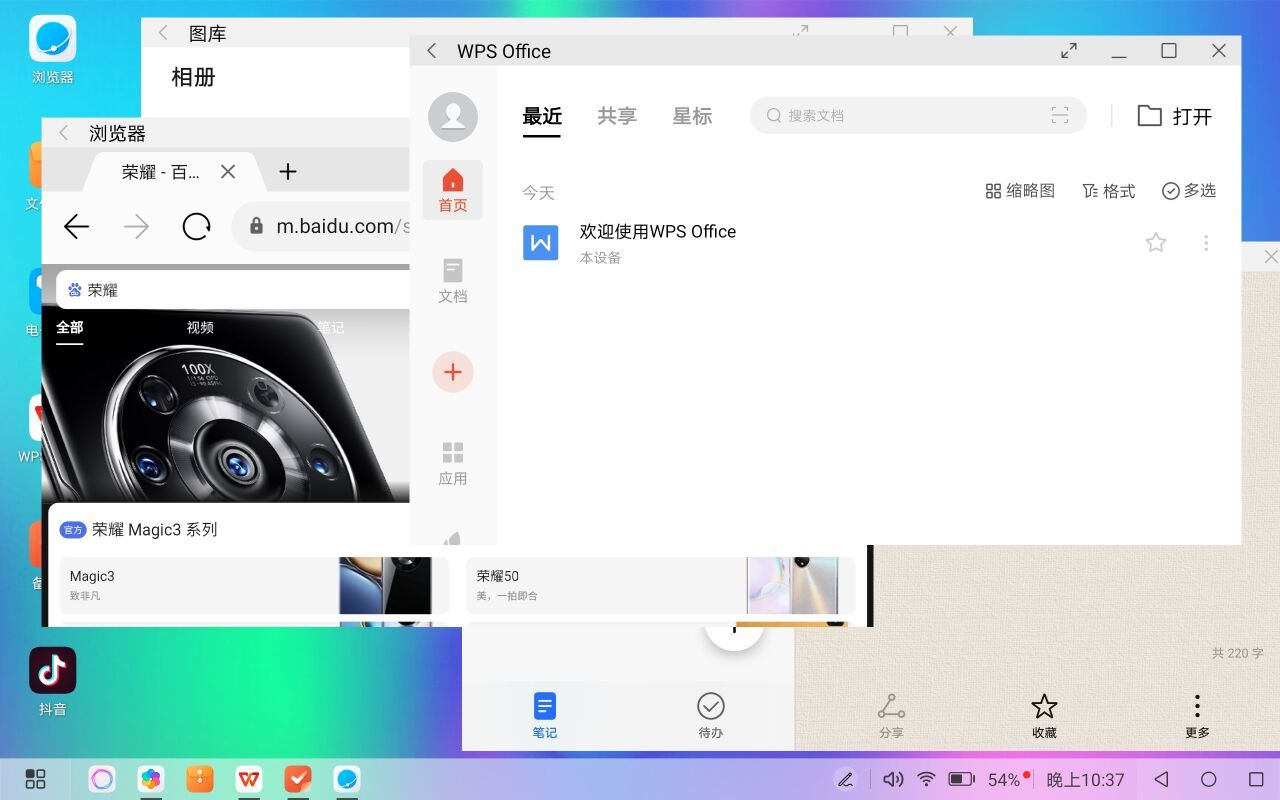 如果开启电脑模式,荣耀平板V7 Pro还会有类Windows电脑的使用体验,打开的应用窗口大小可调节、位置可移动。可以同时打开邮件、备忘录、WPS、微信等。