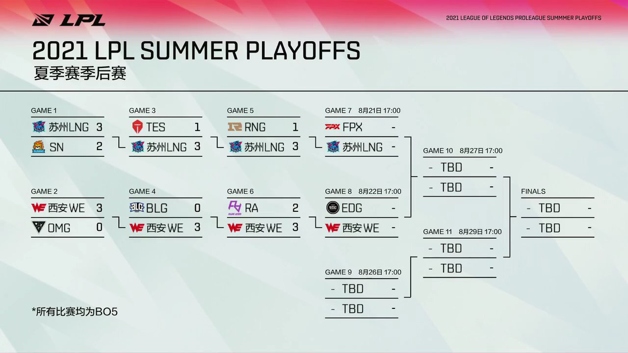 至此,2021 年 LPL 夏季赛季后赛的四强已经全部诞生,包括在常规赛排名前二的 FPX、EDG,以及刚刚获胜的苏州 LNG、西安 WE。