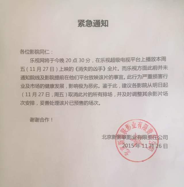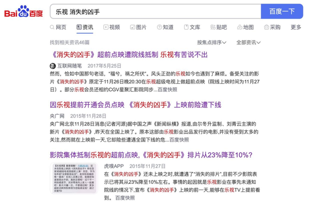 2015年,乐视的《消失的凶手》就曾经打算在11月27日影片公映的前一天,提前上线乐视TV。但这其实只是一个针对仅仅5万乐视会员用户的点映营销活动,却惹怒了国内的各大院线,引起轩然大波。