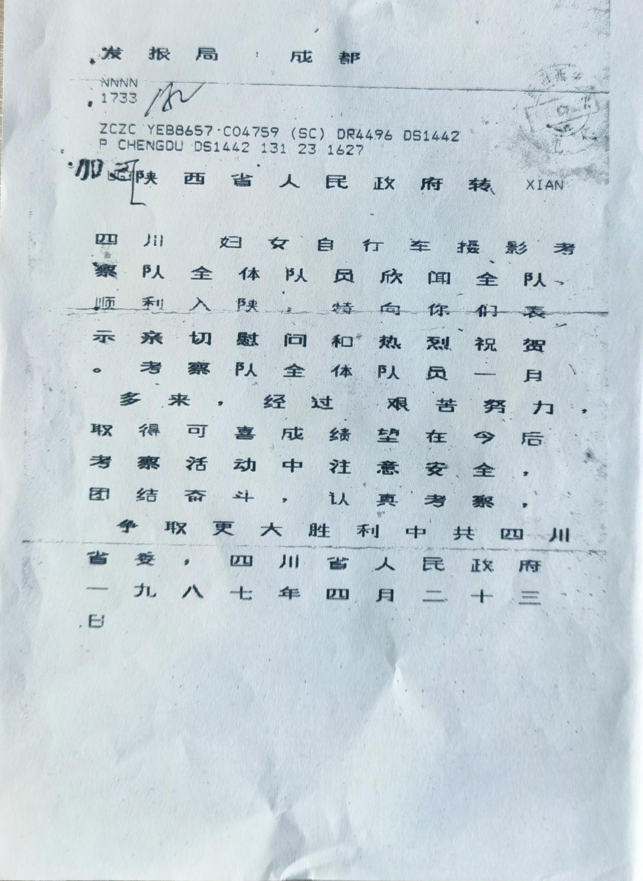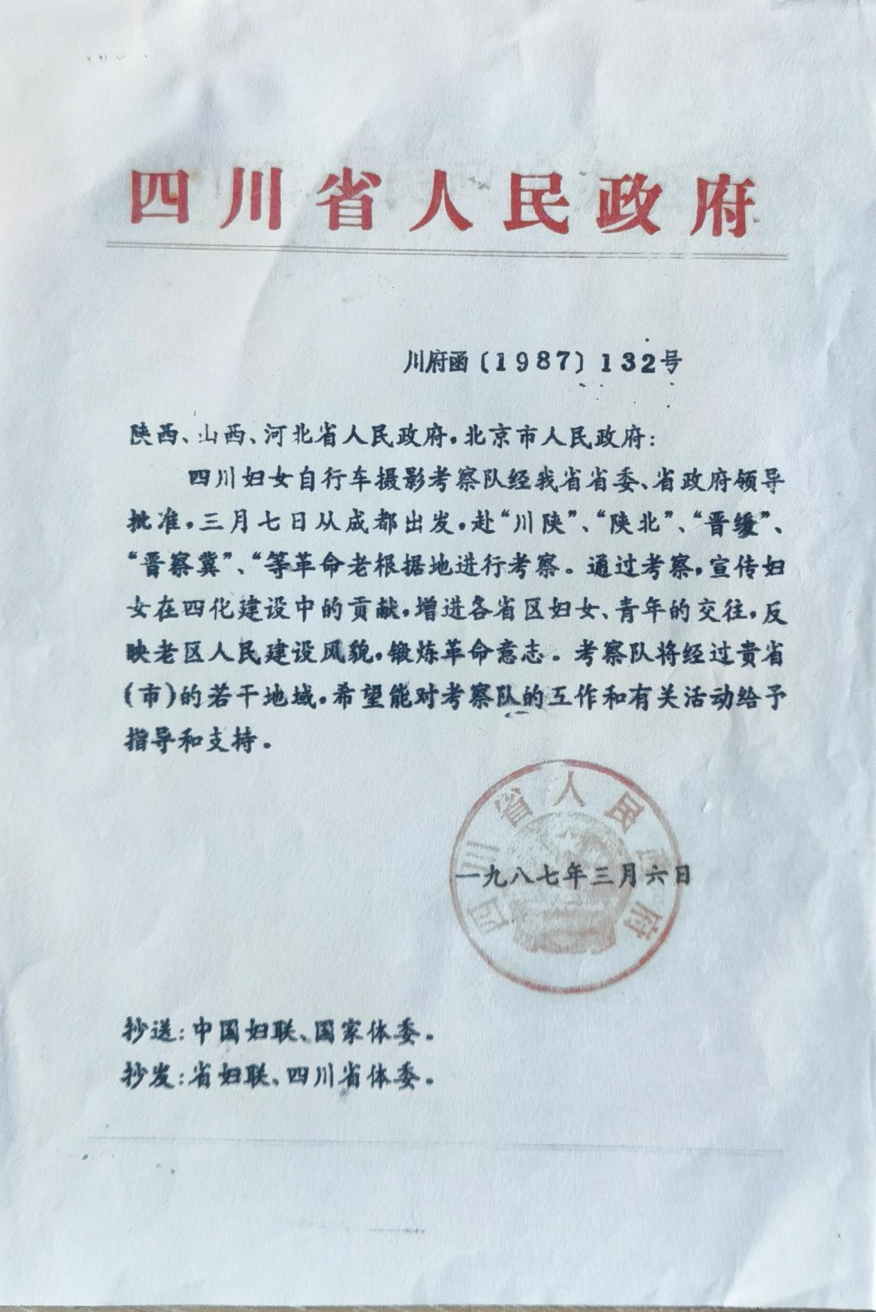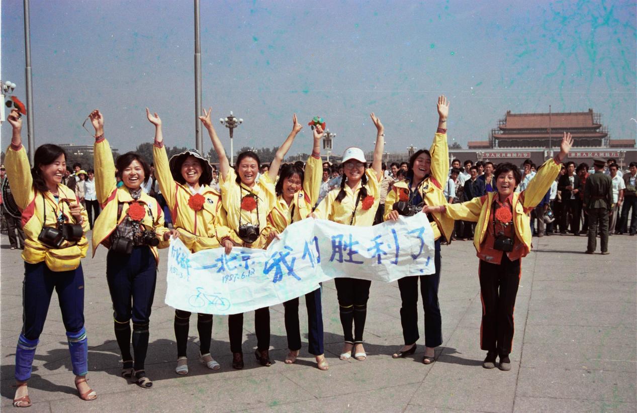1987年3月8日,从成都出发的“四川妇女自行车摄影考察队”6月12日到达北京。北京市人民政府在天安门广场的人民英雄纪念碑下为“车队”举行了“文革”十年之后的第一场盛大入城式。一个省级政府和办公厅与途经省、市同时行文的摄影行为,至今尚属全球首次。