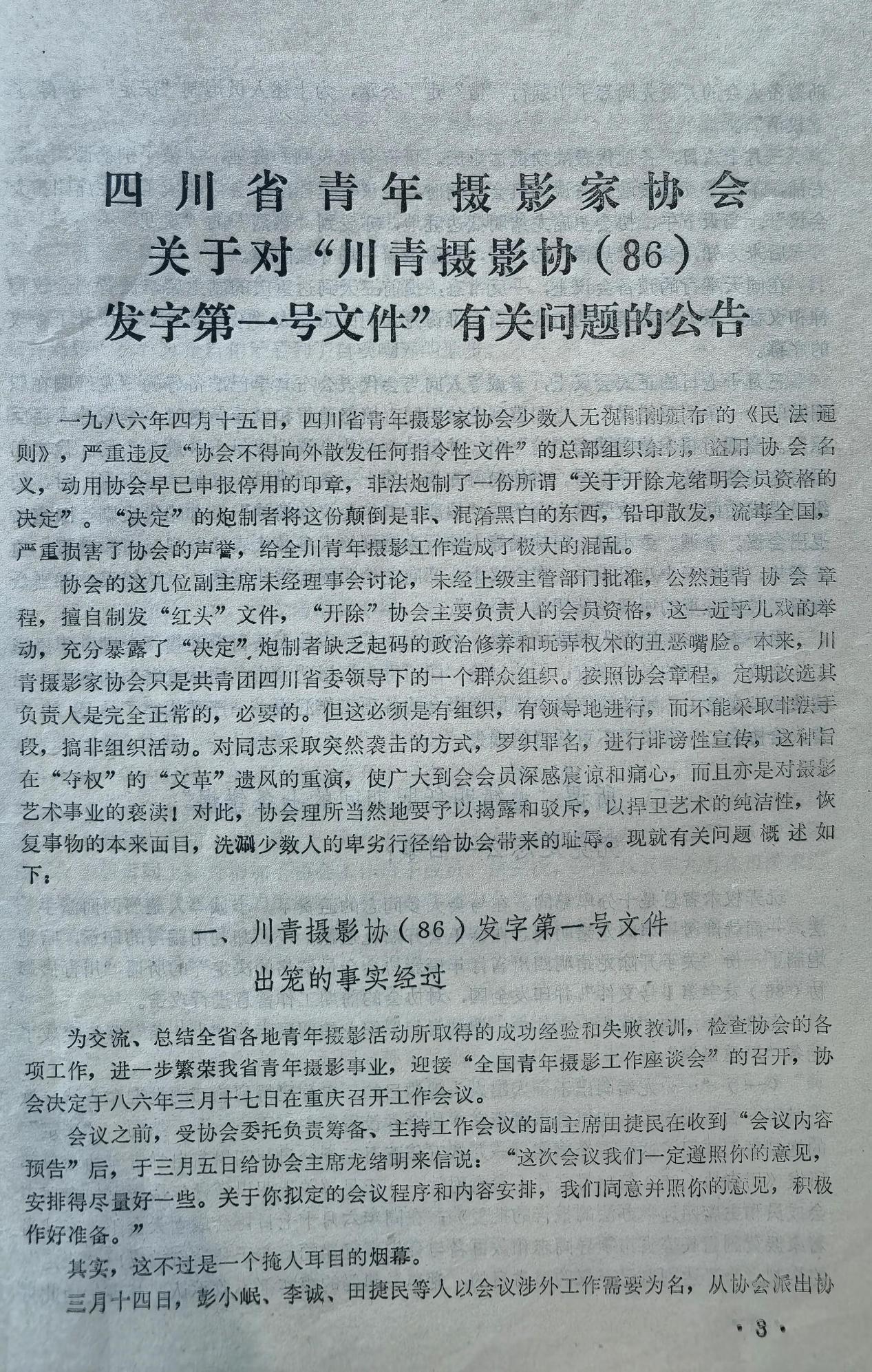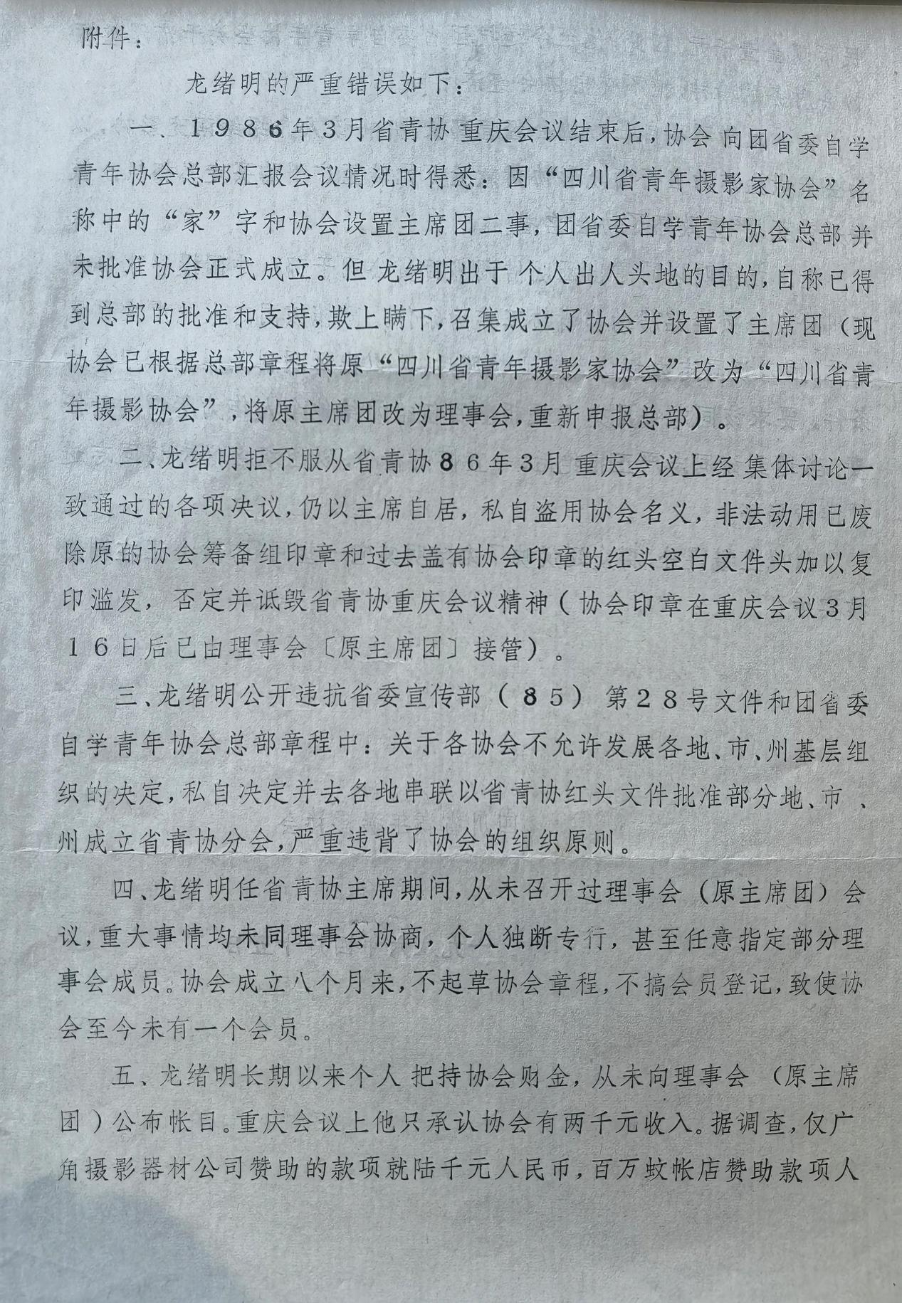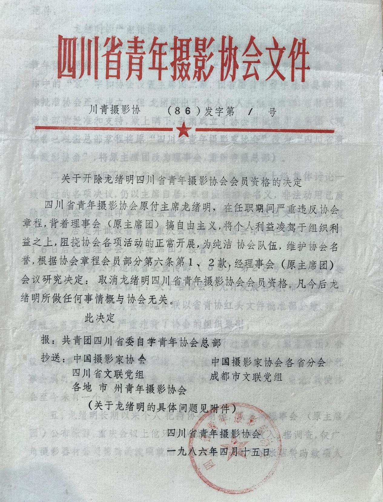 这份“川青摄协(86)发字第1号”文件内容是什么?我想都想不到,是关于开除龙绪明四川省青年摄影家协会会员资格的决定。用“红头文件”形式开除一个“会员”的资格截今为止,是前无古人,后无来者的,所以,我荣幸地把它算做自己的又一项“世界纪录”。