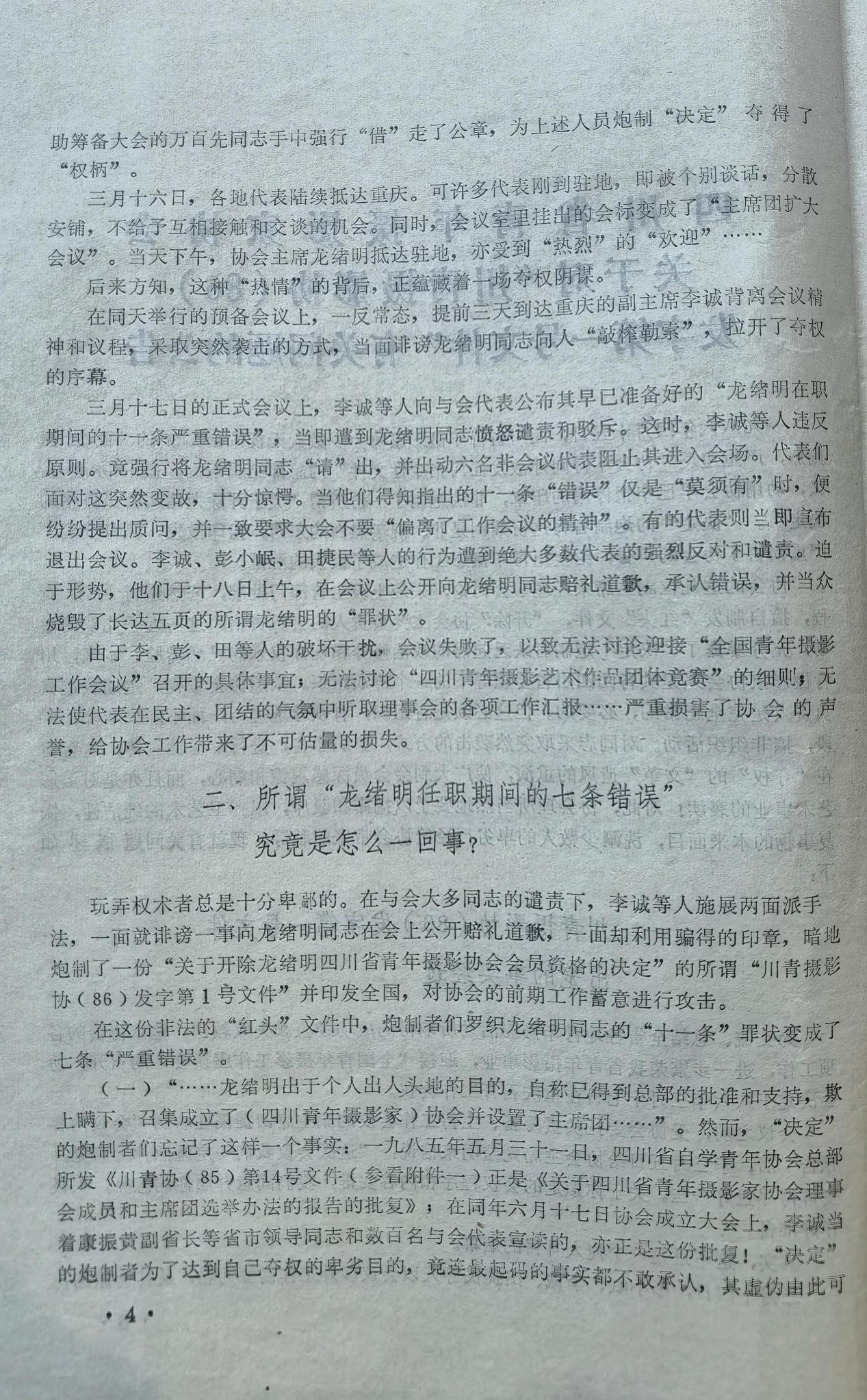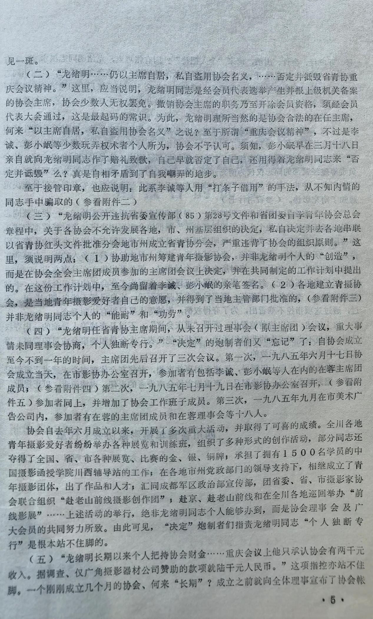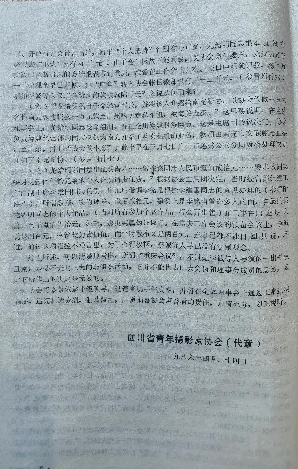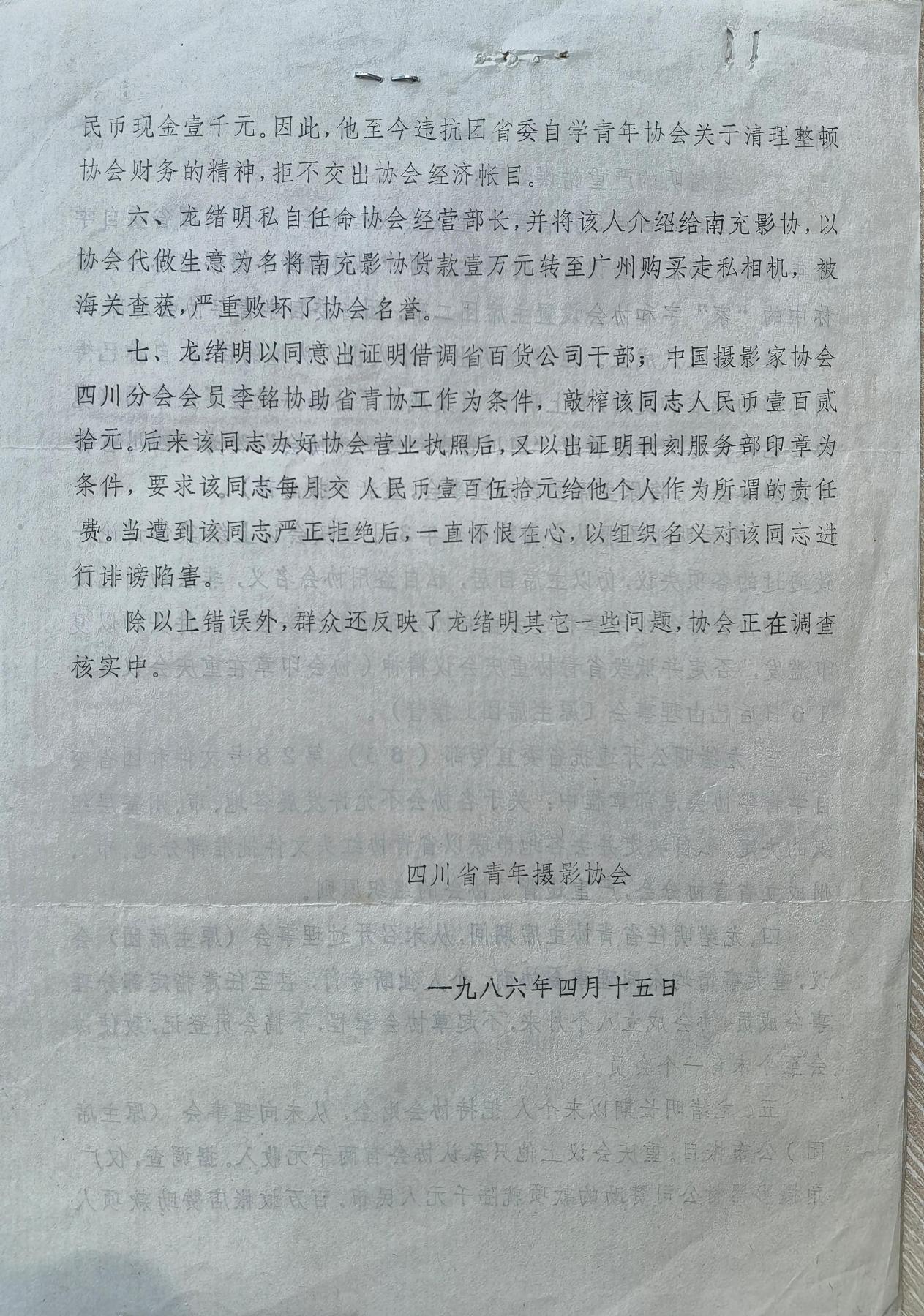 这份“川青摄协(86)发字第1号”文件内容是什么?我想都想不到,是关于开除龙绪明四川省青年摄影家协会会员资格的决定。用“红头文件”形式开除一个“会员”的资格截今为止,是前无古人,后无来者的,所以,我荣幸地把它算做自己的又一项“世界纪录”。