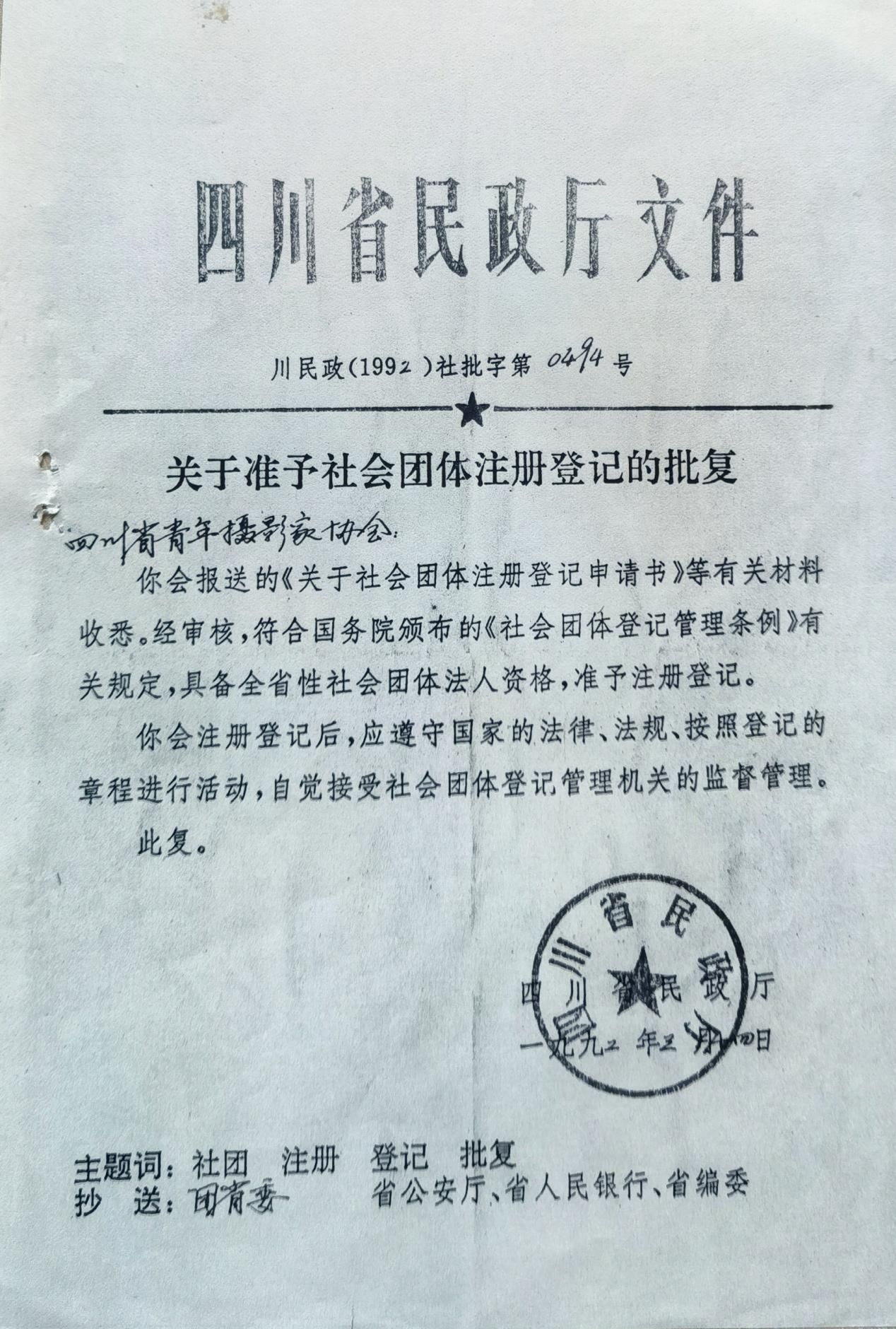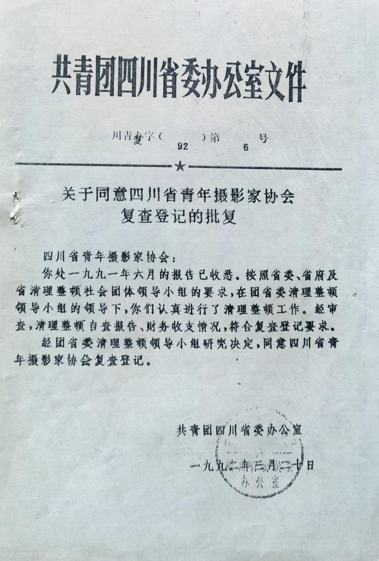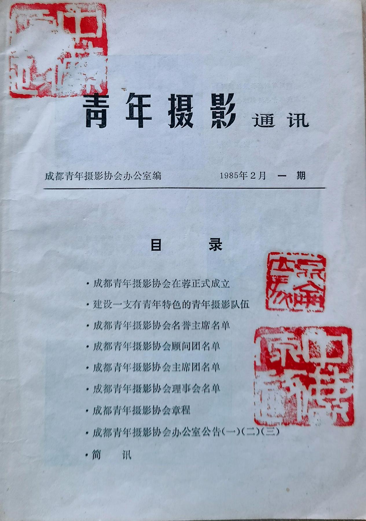 1986年4月15日,一份盖章“四川省青年摄影家协会”大红印章却署名为“四川省青年摄影协会”的红头文件,向全国有关和无关的机关、单位和社团铺天盖地邮发了出去,仅成都市摄影家协会和市美协、市书协、市音协联合办公由成都市群众艺术馆给的那间小小的办公室就收到了四份。当然,还不算馆办和其他办公室……