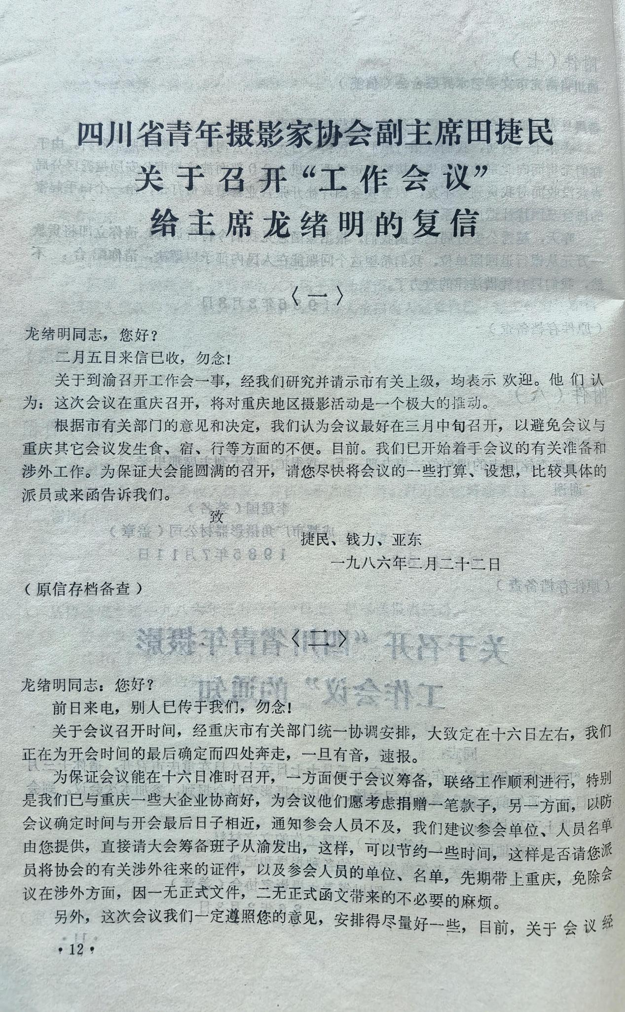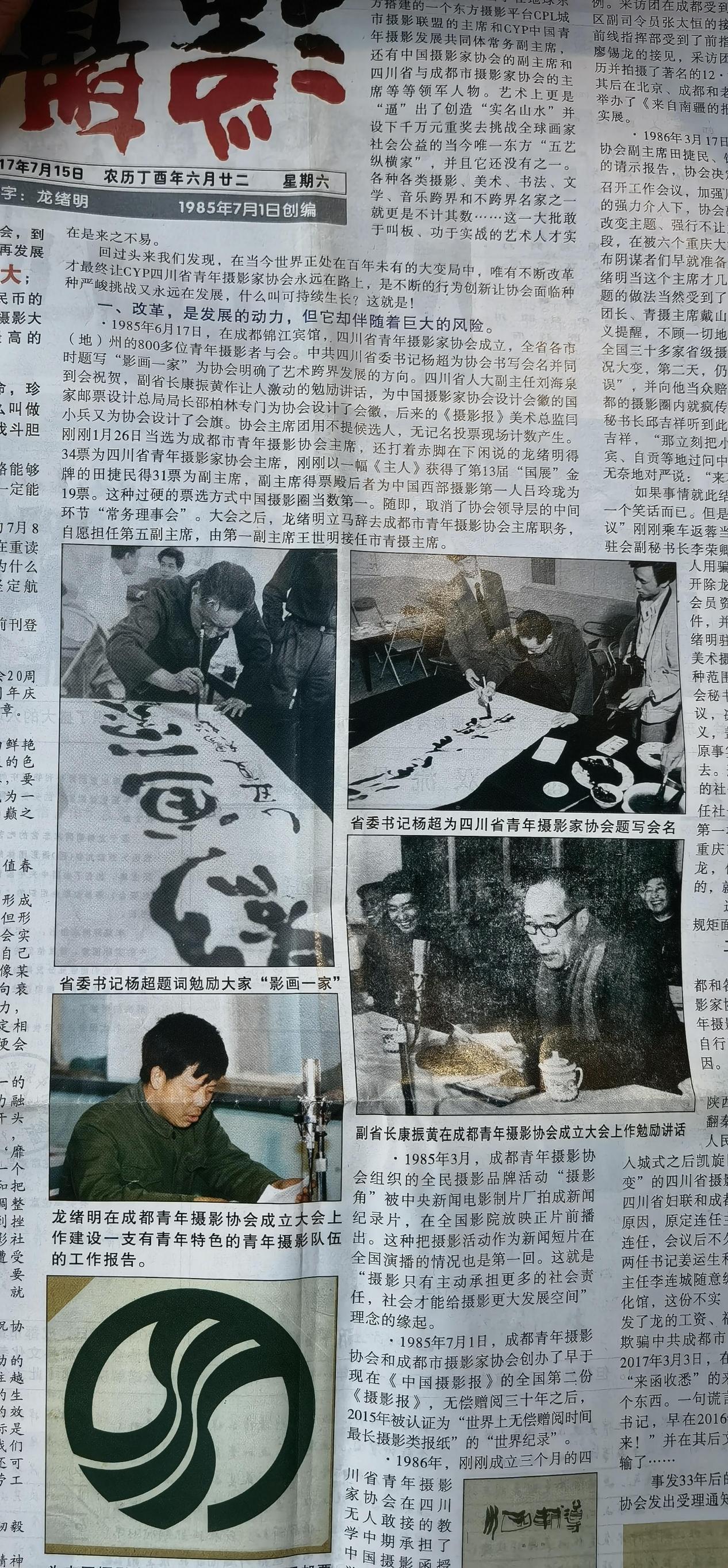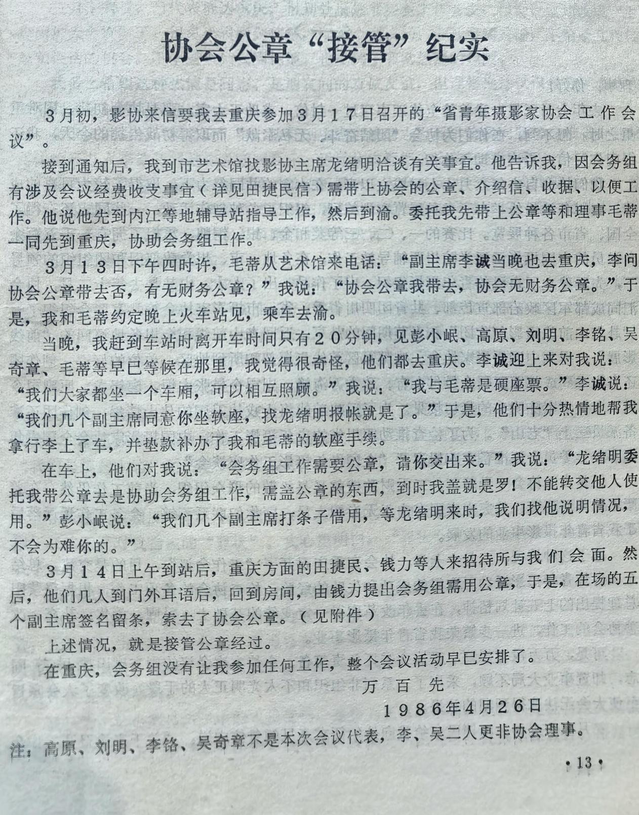 1986年4月15日,一份盖章“四川省青年摄影家协会”大红印章却署名为“四川省青年摄影协会”的红头文件,向全国有关和无关的机关、单位和社团铺天盖地邮发了出去,仅成都市摄影家协会和市美协、市书协、市音协联合办公由成都市群众艺术馆给的那间小小的办公室就收到了四份。当然,还不算馆办和其他办公室……
