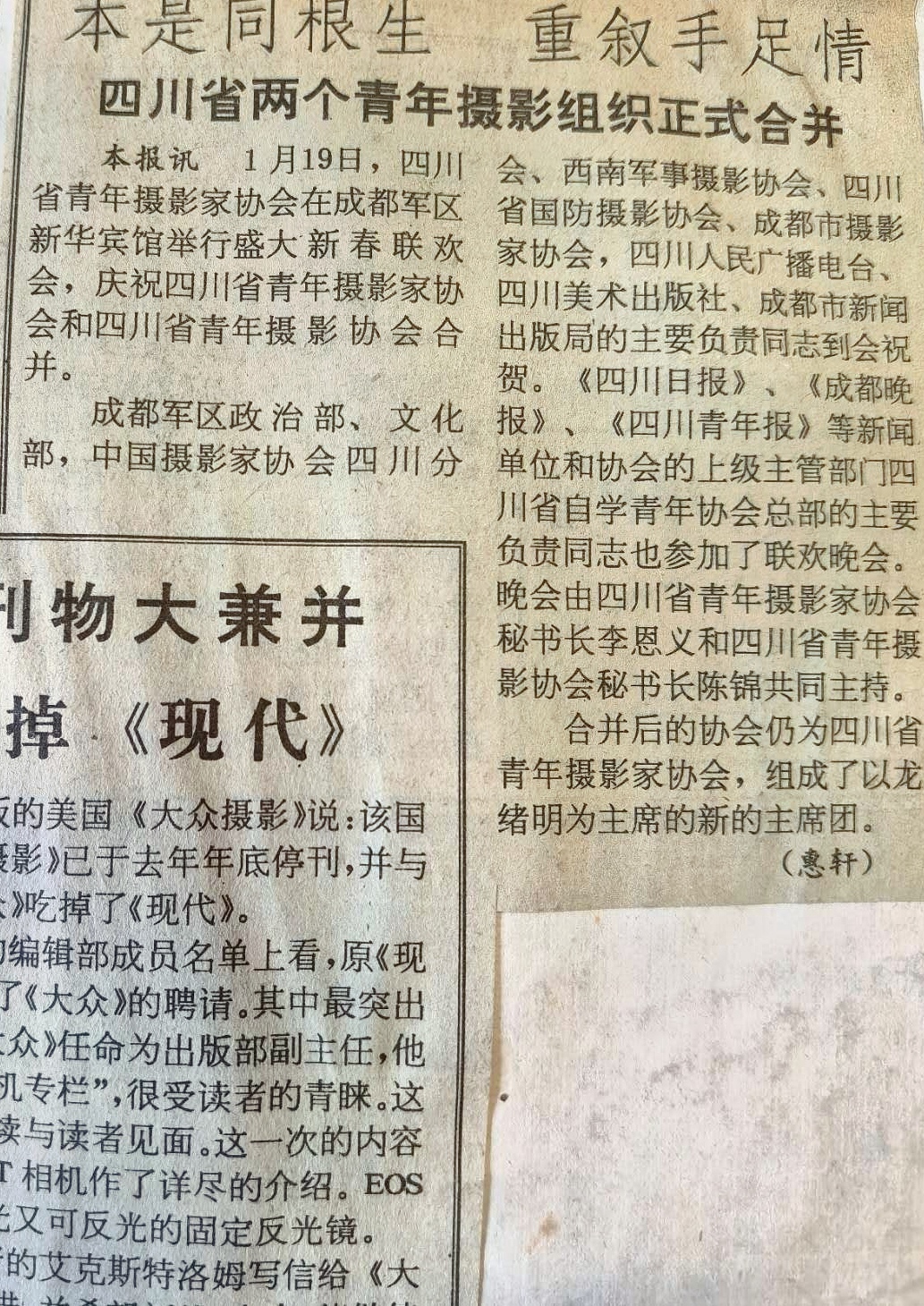 硬拼到了1992年,四川的两个青年摄协在共青团四川省委的过问和四川省摄影家协会与军人摄协的支持下,由四川省摄影家协会时任主席张艺学、常务副主席牟航远主持,在成都军区新华宾馆进行了合并。