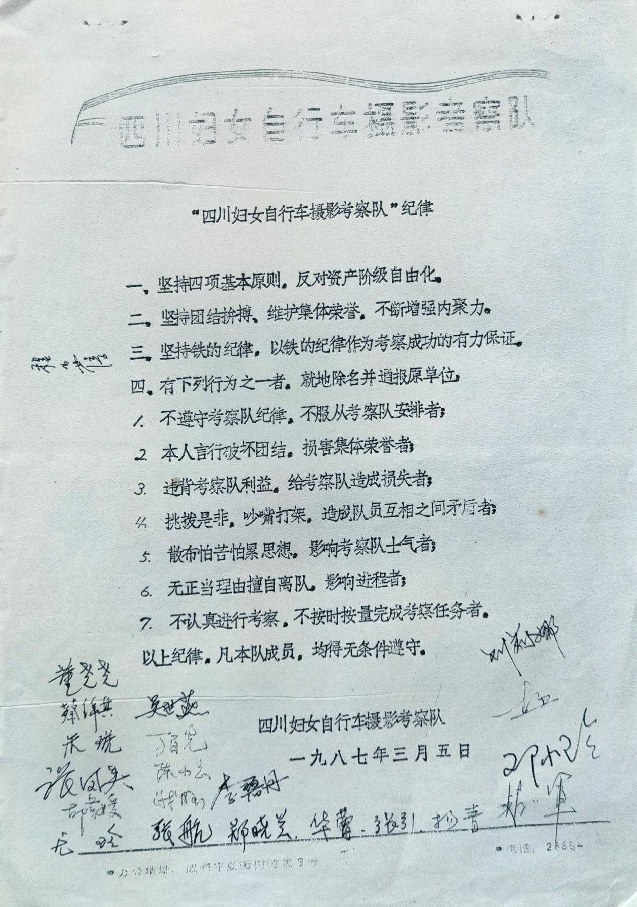 由于协会刚刚就有被夺印“事变”的深刻教训,对这次和前事一样的夺权、夺印恶行,我们早有准备,让李丹担任队长,就是因为她有坚定的原则立场和对事业执着追求的坚定信心。在成都,我们就制定了考察纪律,让参加者明明白白地签上自己必须遵守的签名,对这需无条件遵守的纪律如有任何违反,车队就自动除名。