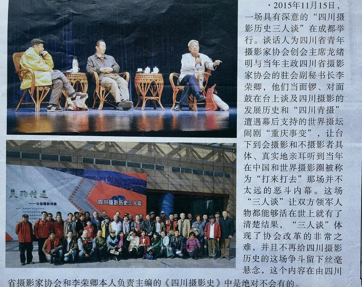 2015年11月15日,我特意和当年“事变”的总策划李副秘书长在成都做了一次“四川摄影历史三人谈”,在众目睽睽之下我步步紧逼,让他亲口说出了“当年我们确实对不起龙绪明……”