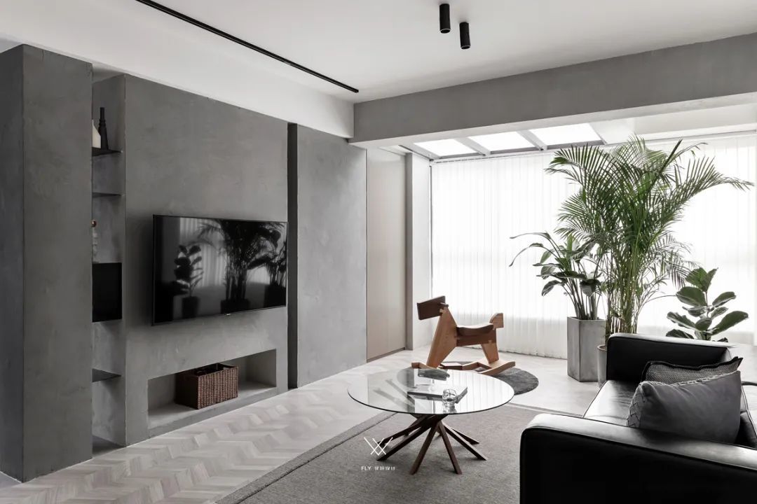 ▲电视墙独特的水泥灰质感定制而成的背景墙,壁挂上电视机,加入地台式电视柜的设计,左侧还有一个镂空的展示架,也让空间显得更加高级优雅。