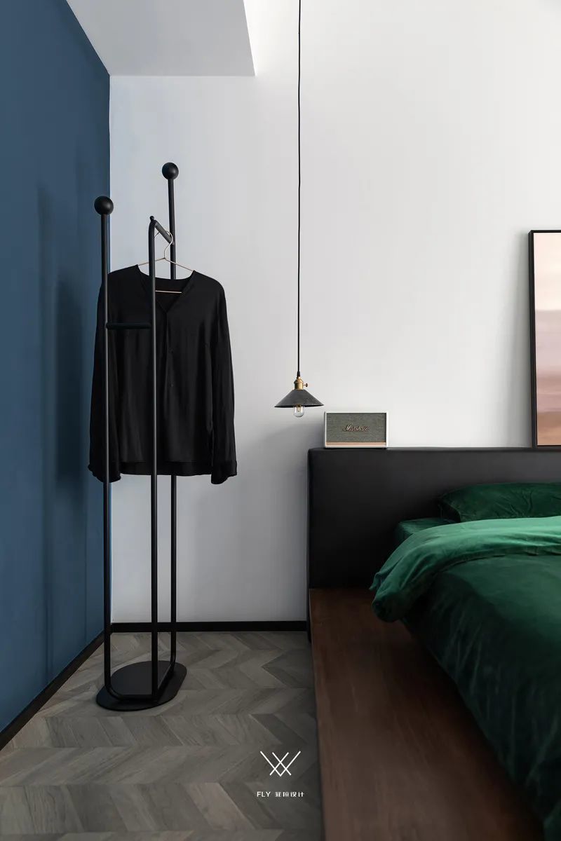 ▲侧边蓝色的墙面,搭配黑色的衣帽架,也让空间显得更加安静优雅。