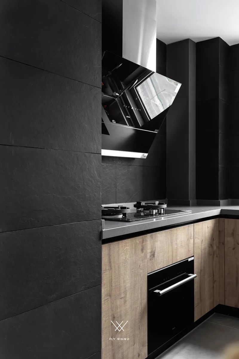 ▲厨房墙面以深灰色的仿古砖,装上原木质感的橱柜,也让做饭空间更加极简自然。