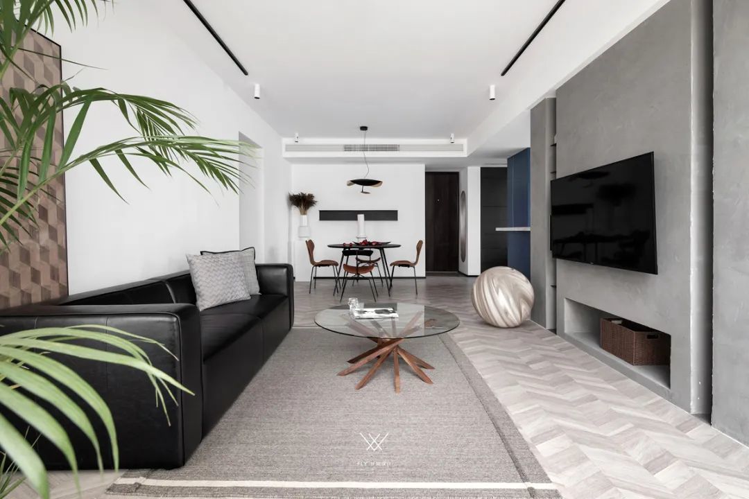 ▲简约风的客厅,在电视墙加入水泥灰的质感,沙发墙是净白的墙面,地面铺上鱼骨铺的木地板,结合玻璃圆茶几的设计,垫上麻灰色的地毯,让空间显得更加朴素大气。