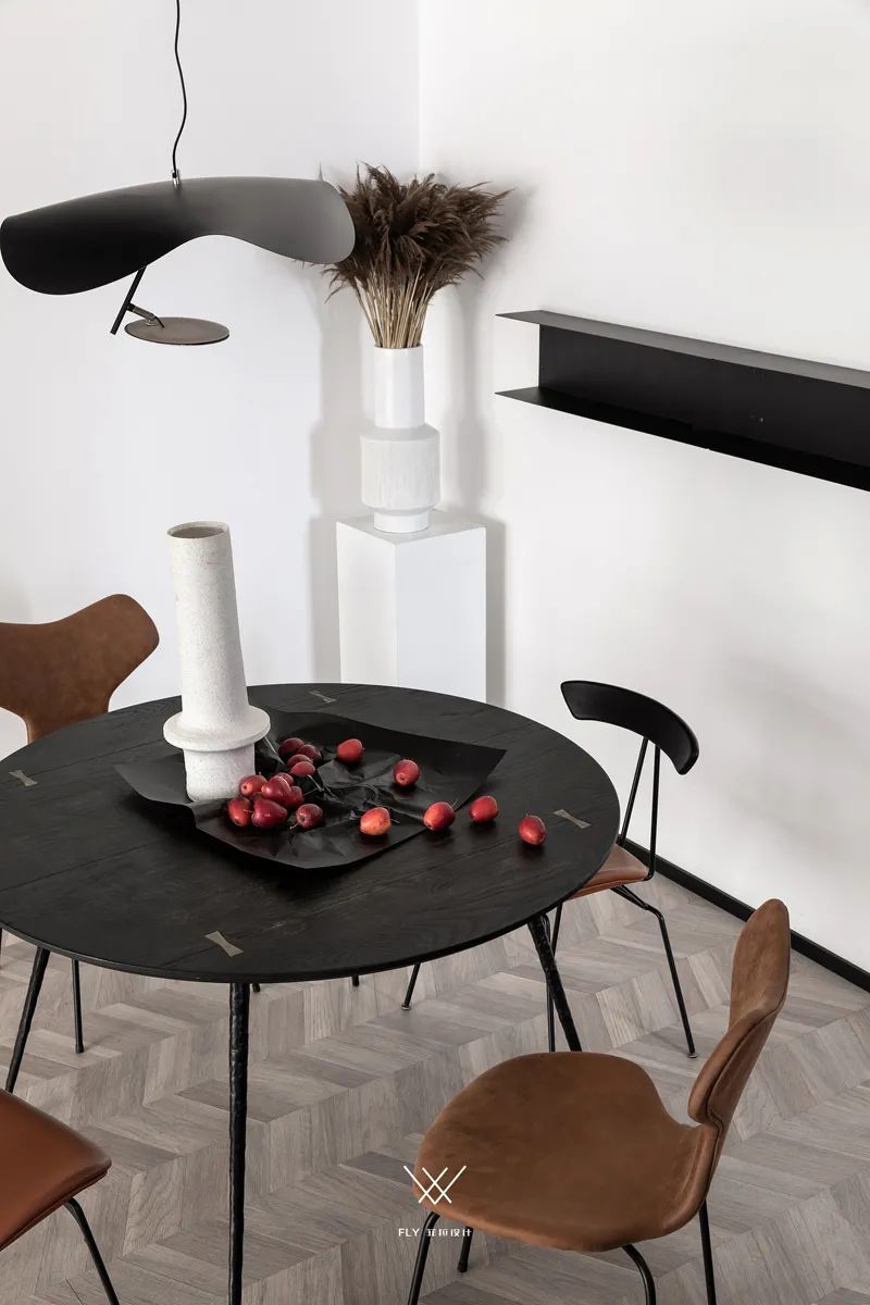 ▲白色花瓶插上芦苇,墙面装上一道黑色的装饰展示架,餐台上布置果盘装饰,也让餐厅空间文艺而高级。