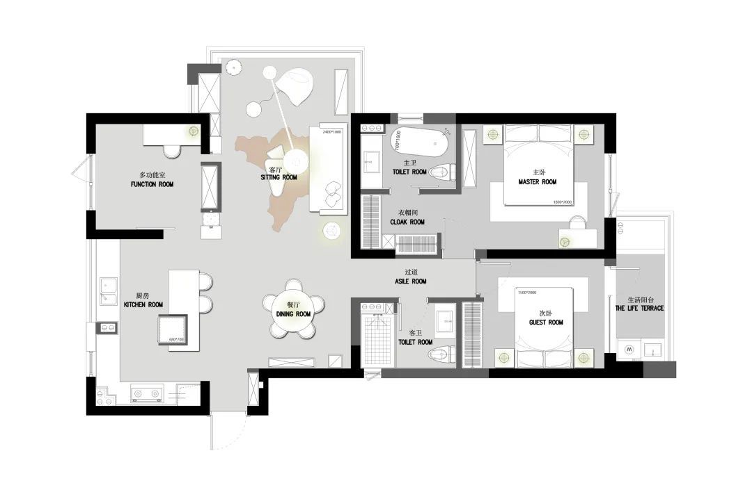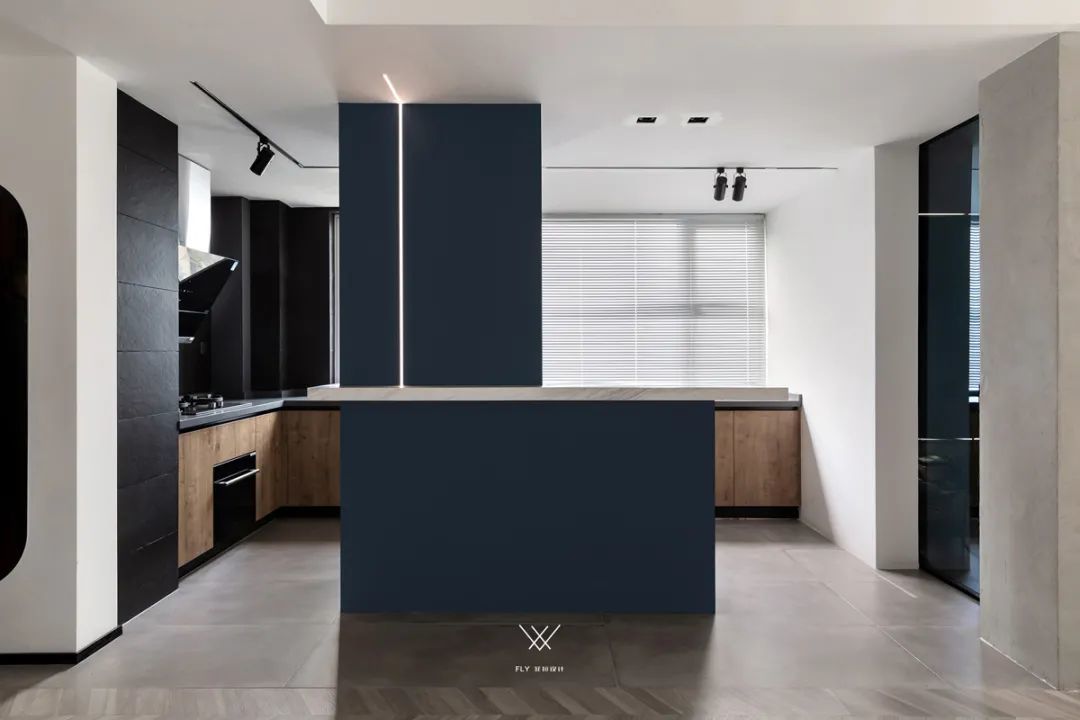 ▲厨房隔着隔墙在两侧都留了环绕的通道动线,以百叶帘的设计下,也让空间显得根基通透而明亮大气。