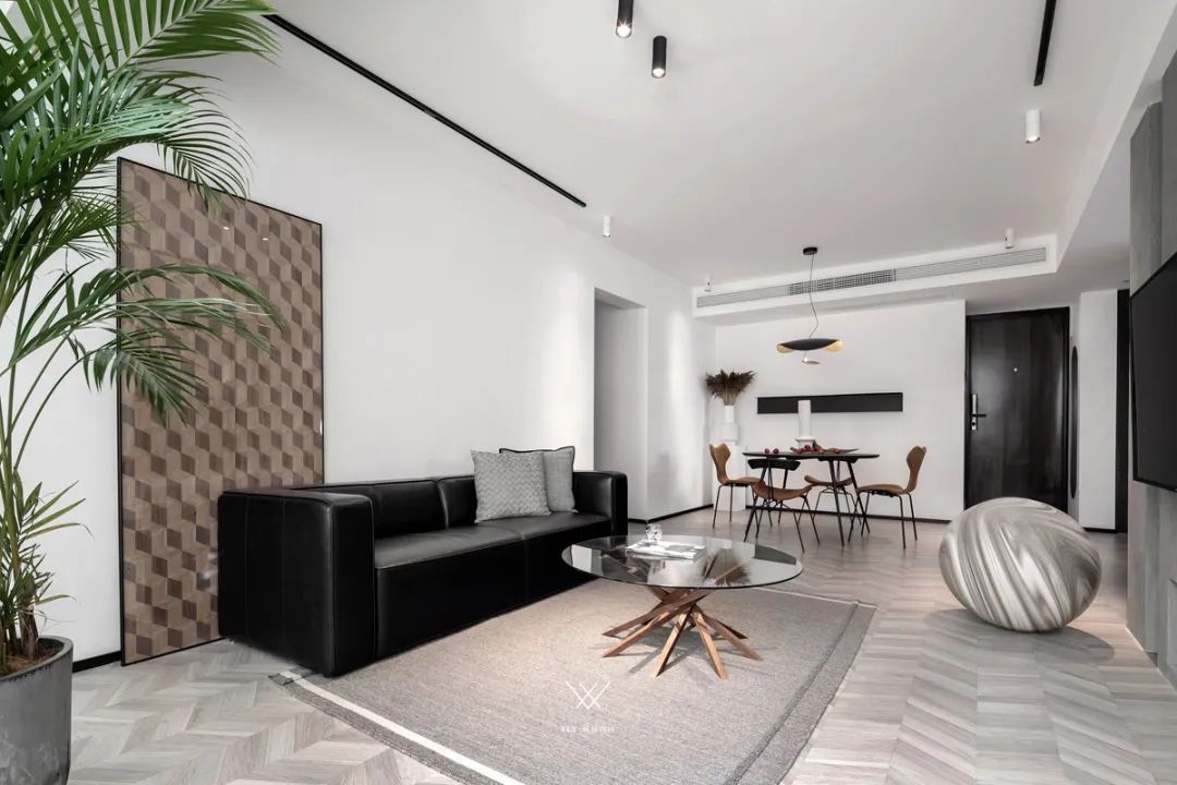 ▲洁净的沙发墙,布置一幅大尺寸的装饰画,搭配黑色的皮沙发,也让沙发墙显得简约而优雅,在天花上是做成了无主灯的设计,筒灯与灯带组合,也让空间朴素高级。