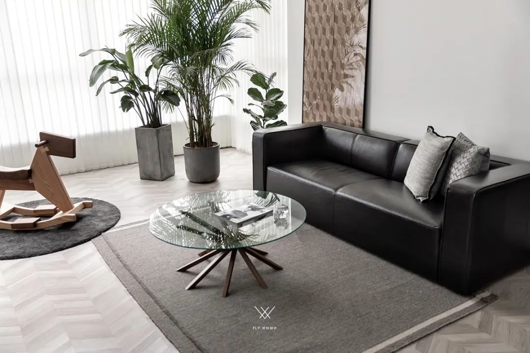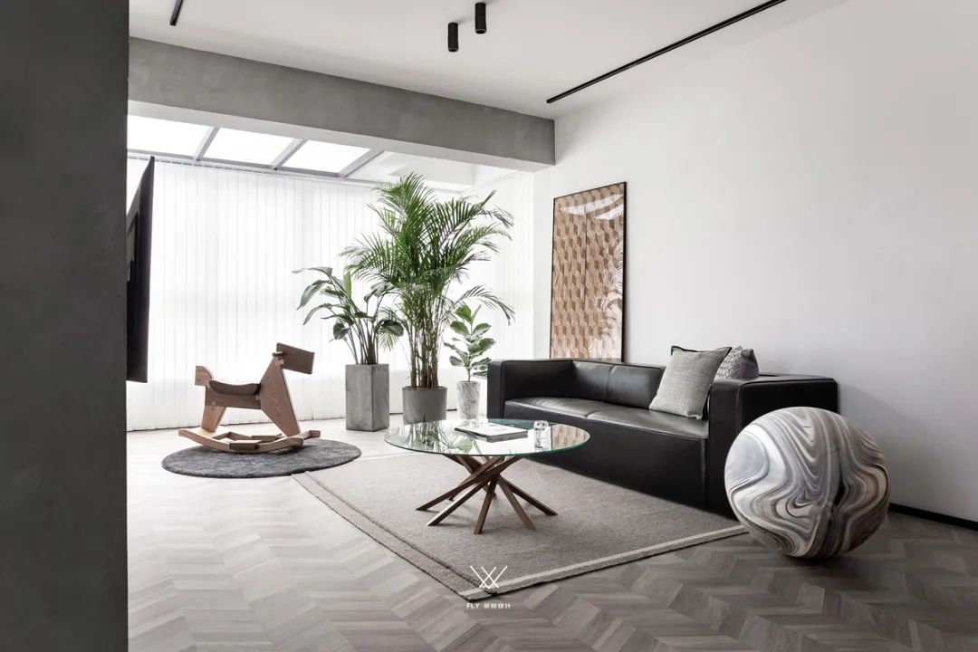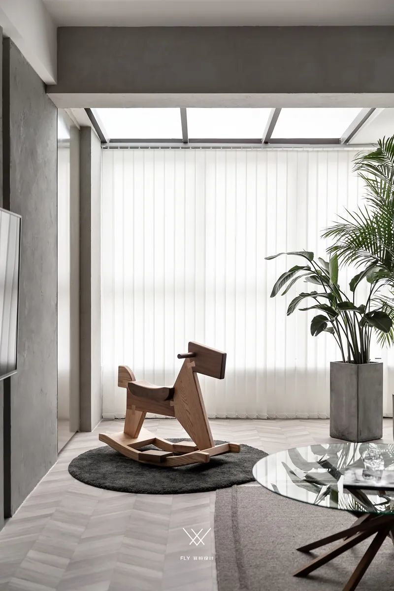 ▲通过水泥盆的绿植,还有玩具木马的布置,也让空间显得更加简约清新而有趣。